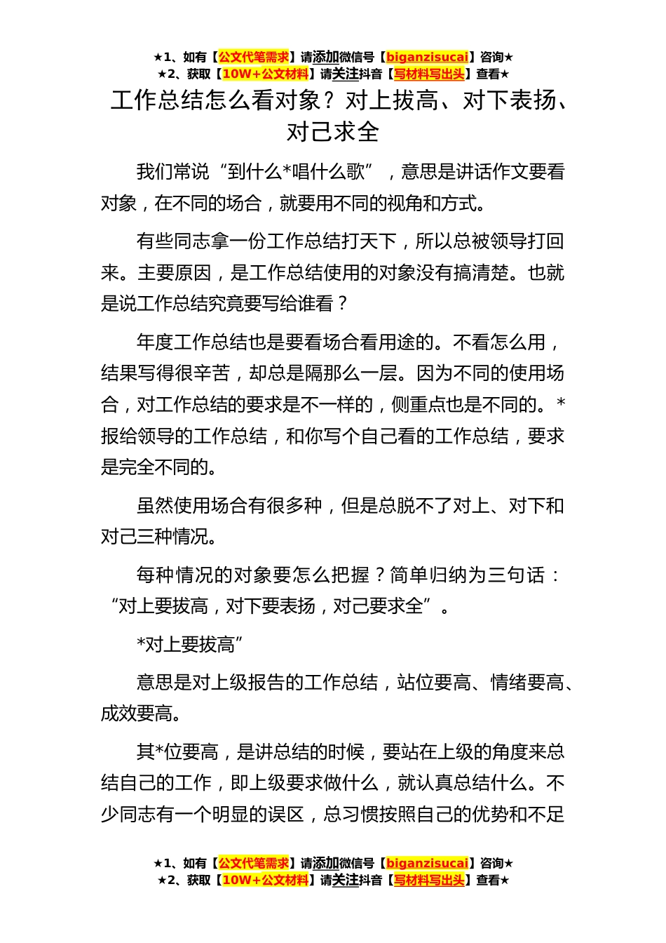 ★1、如有【公文代笔需求】请添加微信号【biganzisucai】咨询★★2、获取【10W+公文材料】请关注抖音【写材料写出头】查看★★1、如有【公文代笔需求】请添加微信号【biganzisucai】咨询★★2、获取【10W+公文材料】请关注抖音【写材料写出头】查看★★1、如有【公文代笔需求】请添加微信号【biganzisucai】咨询★★2、获取【10W+公文材料】请关注抖音【写材料写出头】查看★工作总结怎么看对象?对上拔高、对下表扬、对己求全我们常说“到什么*唱什么歌”,意思是讲话作文要看对象,在不同的场合,就要用不同的视角和方式。有些同志拿一份工作总结打天下,所以总被领导打回来。主要原因,是工作总结使用的对象没有搞清楚。也就是说工作总结究竟要写给谁看?年度工作总结也是要看场合看用途的。不看怎么用,结果写...