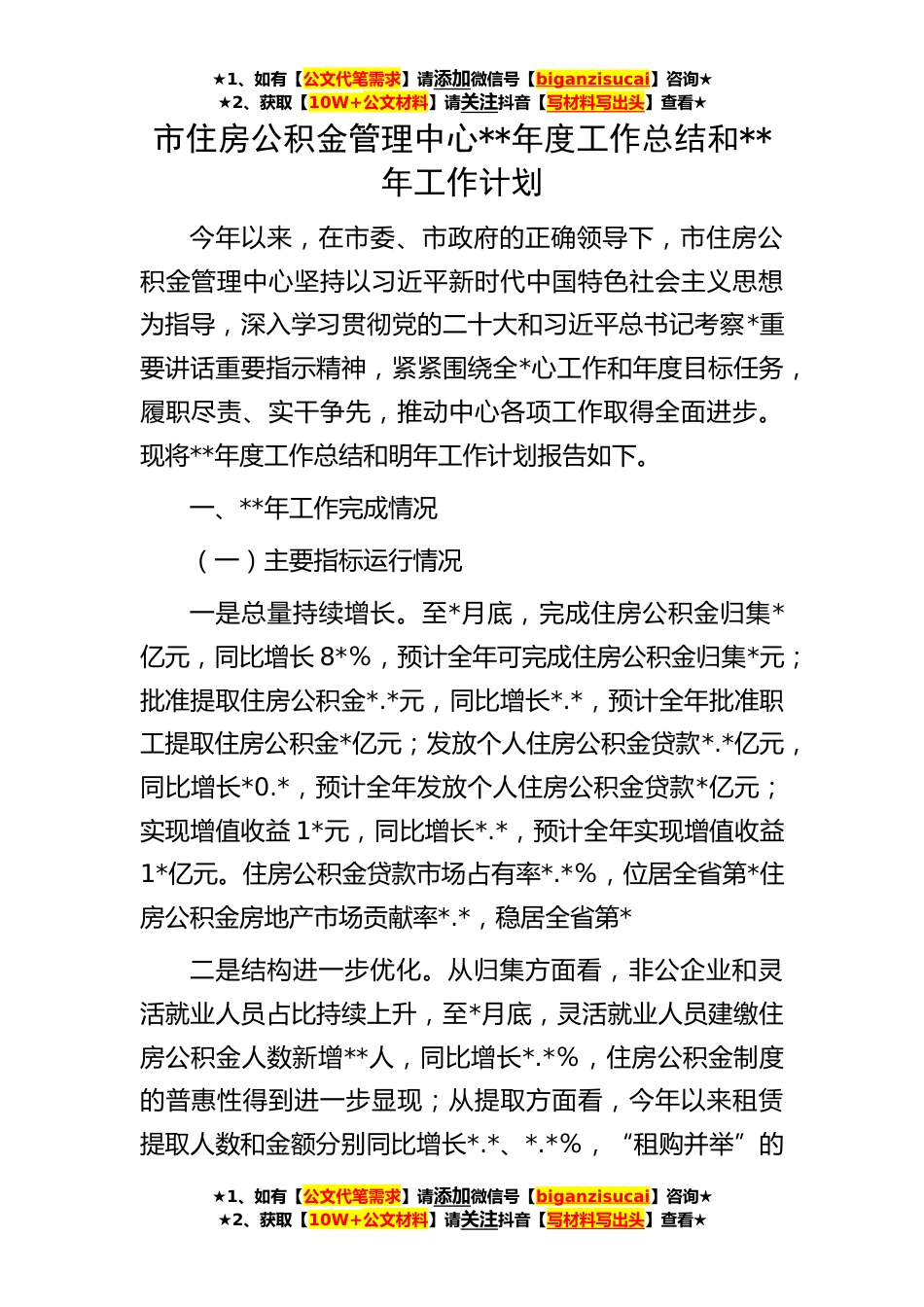 ★1、如有【公文代笔需求】请添加微信号【biganzisucai】咨询★★2、获取【10W+公文材料】请关注抖音【写材料写出头】查看★★1、如有【公文代笔需求】请添加微信号【biganzisucai】咨询★★2、获取【10W+公文材料】请关注抖音【写材料写出头】查看★★1、如有【公文代笔需求】请添加微信号【biganzisucai】咨询★★2、获取【10W+公文材料】请关注抖音【写材料写出头】查看★市住房公积金管理中心**年度工作总结和**年工作计划今年以来,在市委、市政府的正确领导下,市住房公积金管理中心坚持以习近平新时代中国特色社会主义思想为指导,深入学习贯彻党的二十大和习近平总书记考察*重要讲话重要指示精神,紧紧围绕全*心工作和年度目标任务,履职尽责、实干争先,推动中心各项工作取得全面进步。现将**年度工作总...