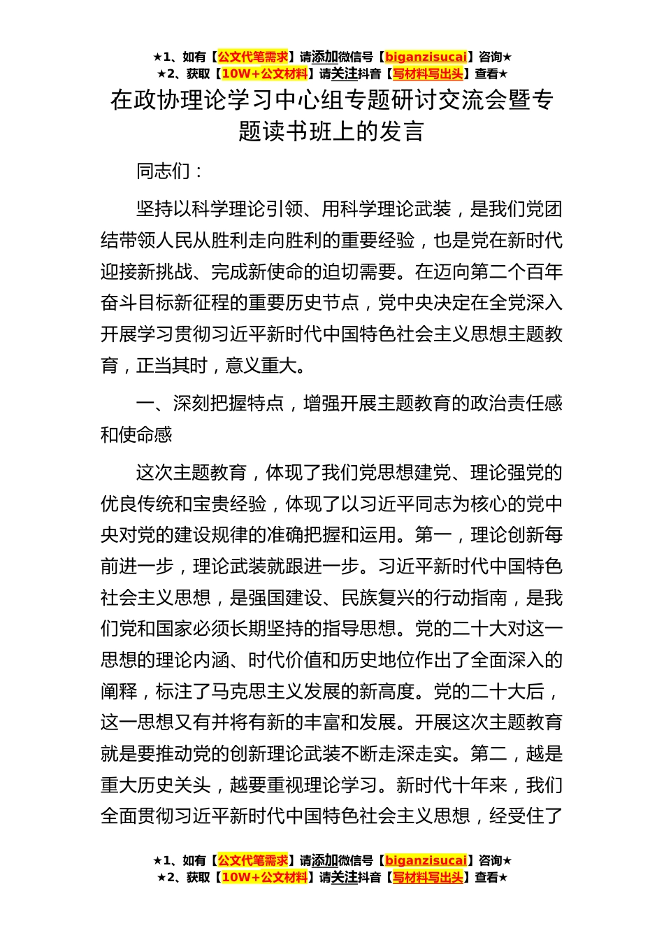 ★1、如有【公文代笔需求】请添加微信号【biganzisucai】咨询★★2、获取【10W+公文材料】请关注抖音【写材料写出头】查看★★1、如有【公文代笔需求】请添加微信号【biganzisucai】咨询★★2、获取【10W+公文材料】请关注抖音【写材料写出头】查看★★1、如有【公文代笔需求】请添加微信号【biganzisucai】咨询★★2、获取【10W+公文材料】请关注抖音【写材料写出头】查看★在政协理论学习中心组专题研讨交流会暨专题读书班上的发言同志们:坚持以科学理论引领、用科学理论武装,是我们党团结带领人民从胜利走向胜利的重要经验,也是党在新时代迎接新挑战、完成新使命的迫切需要。在迈向第二个百年奋斗目标新征程的重要历史节点,党中央决定在全党深入开展学习贯彻习近平新时代中国特色社会主义思想主题教育,正...