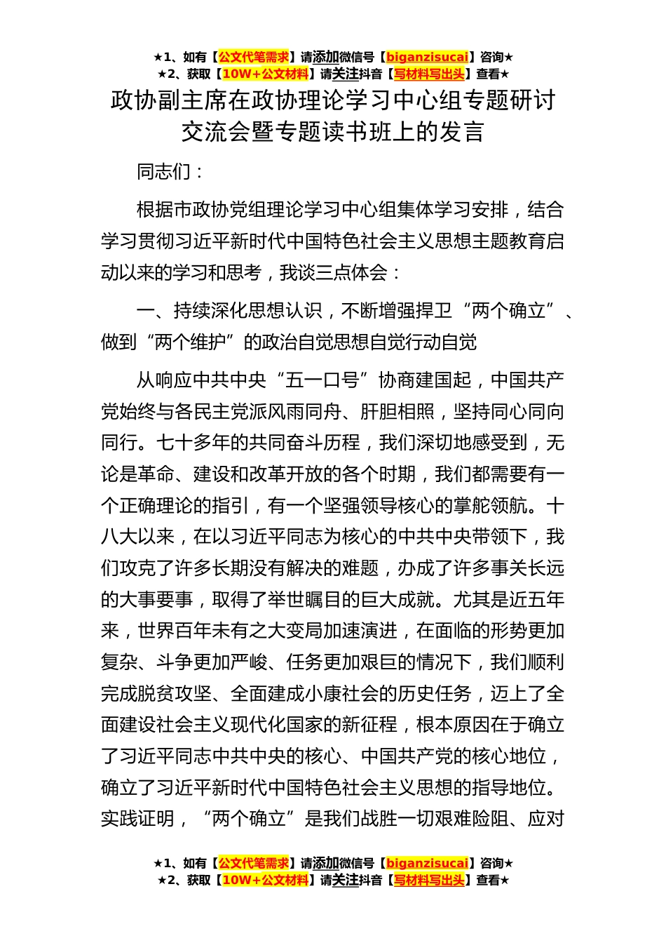 ★1、如有【公文代笔需求】请添加微信号【biganzisucai】咨询★★2、获取【10W+公文材料】请关注抖音【写材料写出头】查看★★1、如有【公文代笔需求】请添加微信号【biganzisucai】咨询★★2、获取【10W+公文材料】请关注抖音【写材料写出头】查看★★1、如有【公文代笔需求】请添加微信号【biganzisucai】咨询★★2、获取【10W+公文材料】请关注抖音【写材料写出头】查看★政协副主席在政协理论学习中心组专题研讨交流会暨专题读书班上的发言同志们:根据市政协党组理论学习中心组集体学习安排,结合学习贯彻习近平新时代中国特色社会主义思想主题教育启动以来的学习和思考,我谈三点体会:一、持续深化思想认识,不断增强捍卫“两个确立”、做到“两个维护”的政治自觉思想自觉行动自觉从响应中共中央“五一口...
