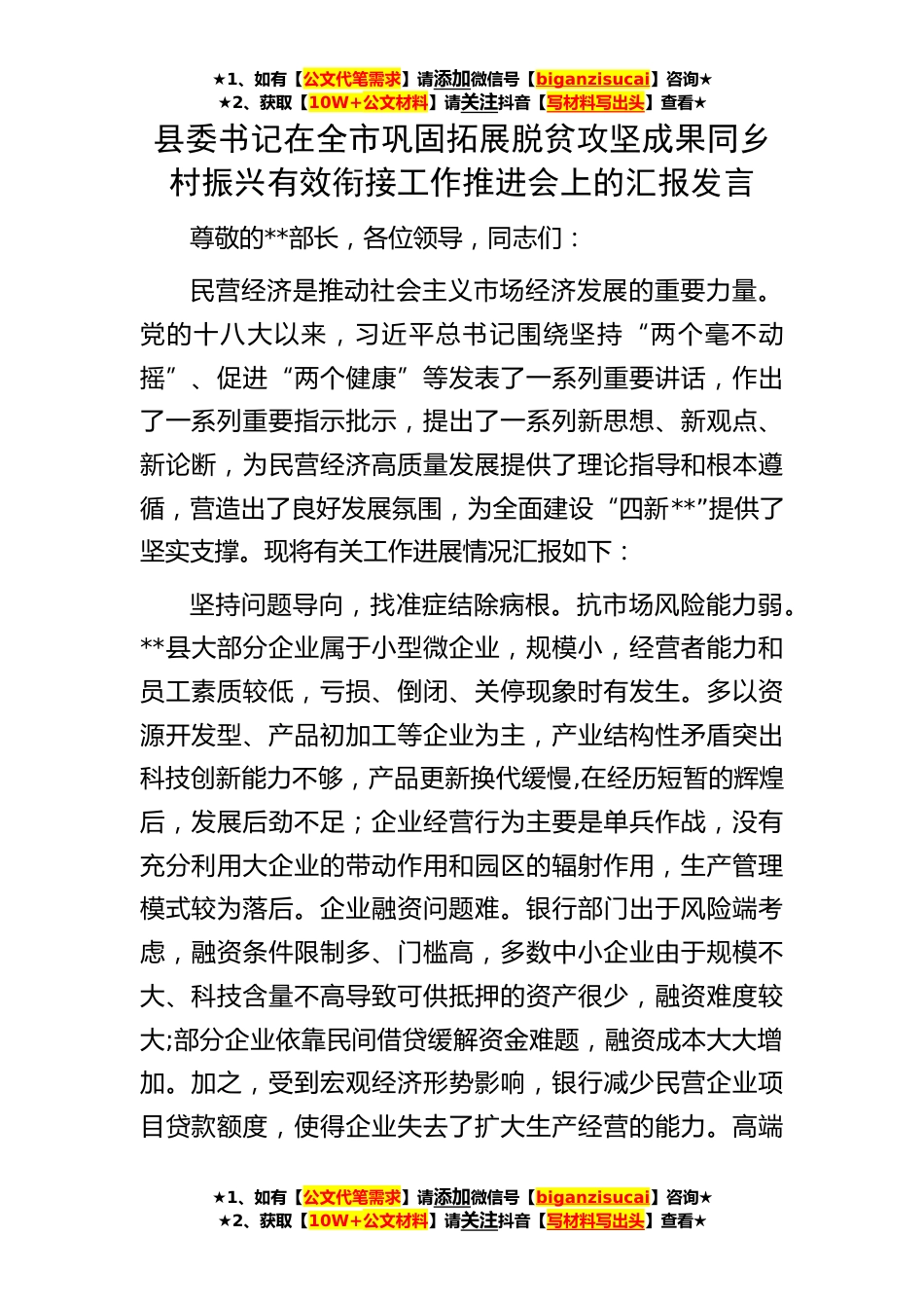 ★1、如有【公文代笔需求】请添加微信号【biganzisucai】咨询★★2、获取【10W+公文材料】请关注抖音【写材料写出头】查看★★1、如有【公文代笔需求】请添加微信号【biganzisucai】咨询★★2、获取【10W+公文材料】请关注抖音【写材料写出头】查看★★1、如有【公文代笔需求】请添加微信号【biganzisucai】咨询★★2、获取【10W+公文材料】请关注抖音【写材料写出头】查看★县委书记在全市巩固拓展脱贫攻坚成果同乡村振兴有效衔接工作推进会上的汇报发言尊敬的**部长,各位领导,同志们:民营经济是推动社会主义市场经济发展的重要力量。党的十八大以来,习近平总书记围绕坚持“两个毫不动摇”、促进“两个健康”等发表了一系列重要讲话,作出了一系列重要指示批示,提出了一系列新思想、新观点、新论断,为民营...