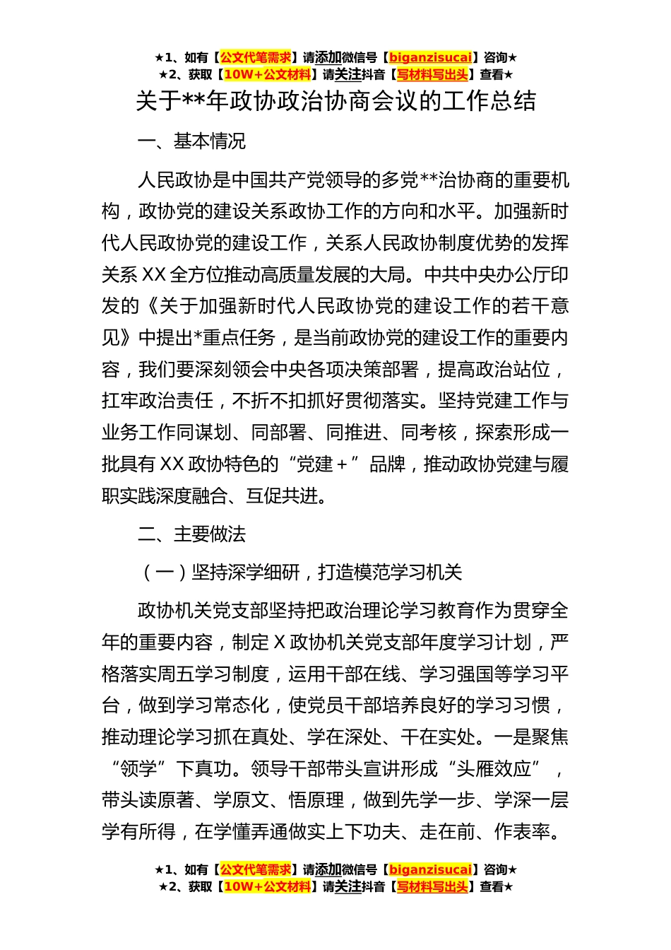 ★1、如有【公文代笔需求】请添加微信号【biganzisucai】咨询★★2、获取【10W+公文材料】请关注抖音【写材料写出头】查看★★1、如有【公文代笔需求】请添加微信号【biganzisucai】咨询★★2、获取【10W+公文材料】请关注抖音【写材料写出头】查看★★1、如有【公文代笔需求】请添加微信号【biganzisucai】咨询★★2、获取【10W+公文材料】请关注抖音【写材料写出头】查看★关于**年政协政治协商会议的工作总结一、基本情况人民政协是中国共产党领导的多党**治协商的重要机构,政协党的建设关系政协工作的方向和水平。加强新时代人民政协党的建设工作,关系人民政协制度优势的发挥关系XX全方位推动高质量发展的大局。中共中央办公厅印发的《关于加强新时代人民政协党的建设工作的若干意见》中提出*重点任务,是当...