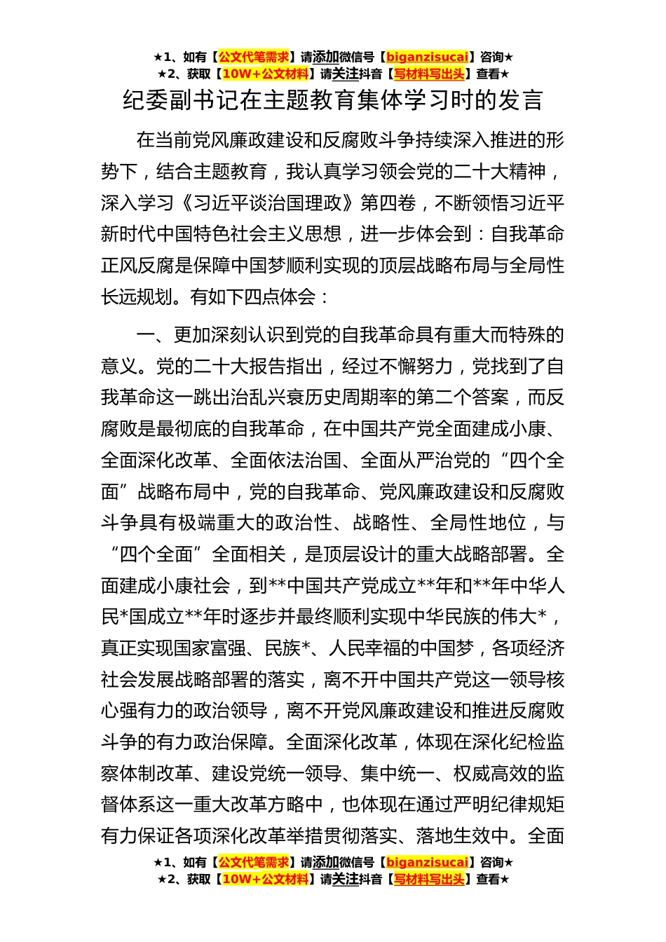 ★1、如有【公文代笔需求】请添加微信号【biganzisucai】咨询★★2、获取【10W+公文材料】请关注抖音【写材料写出头】查看★★1、如有【公文代笔需求】请添加微信号【biganzisucai】咨询★★2、获取【10W+公文材料】请关注抖音【写材料写出头】查看★★1、如有【公文代笔需求】请添加微信号【biganzisucai】咨询★★2、获取【10W+公文材料】请关注抖音【写材料写出头】查看★纪委副书记在主题教育集体学习时的发言在当前党风廉政建设和反腐败斗争持续深入推进的形势下,结合主题教育,我认真学习领会党的二十大精神,深入学习《习近平谈治国理政》第四卷,不断领悟习近平新时代中国特色社会主义思想,进一步体会到:自我革命正风反腐是保障中国梦顺利实现的顶层战略布局与全局性长远规划。有如下四点体会:一、更...