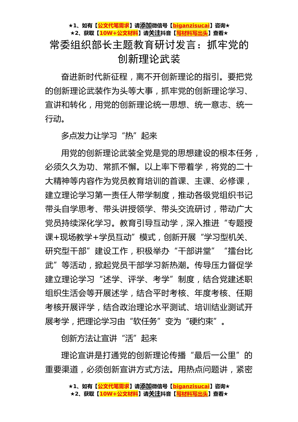★1、如有【公文代笔需求】请添加微信号【biganzisucai】咨询★★2、获取【10W+公文材料】请关注抖音【写材料写出头】查看★★1、如有【公文代笔需求】请添加微信号【biganzisucai】咨询★★2、获取【10W+公文材料】请关注抖音【写材料写出头】查看★★1、如有【公文代笔需求】请添加微信号【biganzisucai】咨询★★2、获取【10W+公文材料】请关注抖音【写材料写出头】查看★常委组织部长主题教育研讨发言:抓牢党的创新理论武装奋进新时代新征程,离不开创新理论的指引。要把党的创新理论武装作为头等大事,抓牢党的创新理论学习、宣讲和转化,用党的创新理论统一思想、统一意志、统一行动。多点发力让学习“热”起来用党的创新理论武装全党是党的思想建设的根本任务,必须久久为功、常抓不懈。以上率下带着学,...