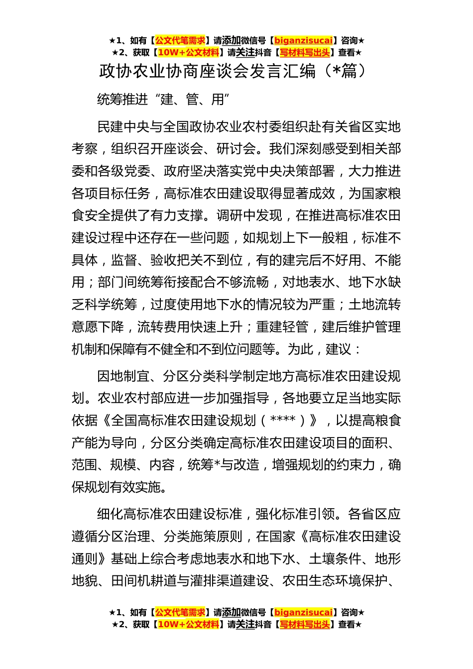 ★1、如有【公文代笔需求】请添加微信号【biganzisucai】咨询★★2、获取【10W+公文材料】请关注抖音【写材料写出头】查看★★1、如有【公文代笔需求】请添加微信号【biganzisucai】咨询★★2、获取【10W+公文材料】请关注抖音【写材料写出头】查看★★1、如有【公文代笔需求】请添加微信号【biganzisucai】咨询★★2、获取【10W+公文材料】请关注抖音【写材料写出头】查看★政协农业协商座谈会发言汇编(*篇)统筹推进“建、管、用”民建中央与全国政协农业农村委组织赴有关省区实地考察,组织召开座谈会、研讨会。我们深刻感受到相关部委和各级党委、政府坚决落实党中央决策部署,大力推进各项目标任务,高标准农田建设取得显著成效,为国家粮食安全提供了有力支撑。调研中发现,在推进高标准农田建设过程中还存...