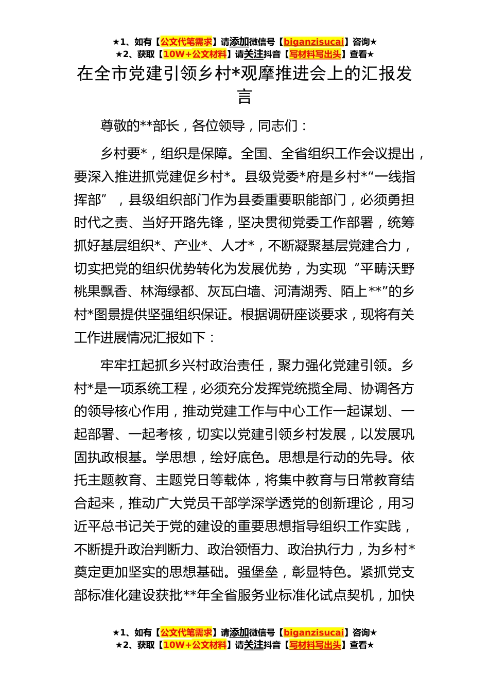 ★1、如有【公文代笔需求】请添加微信号【biganzisucai】咨询★★2、获取【10W+公文材料】请关注抖音【写材料写出头】查看★★1、如有【公文代笔需求】请添加微信号【biganzisucai】咨询★★2、获取【10W+公文材料】请关注抖音【写材料写出头】查看★★1、如有【公文代笔需求】请添加微信号【biganzisucai】咨询★★2、获取【10W+公文材料】请关注抖音【写材料写出头】查看★在全市党建引领乡村*观摩推进会上的汇报发言尊敬的**部长,各位领导,同志们:乡村要*,组织是保障。全国、全省组织工作会议提出,要深入推进抓党建促乡村*。县级党委*府是乡村*“一线指挥部”,县级组织部门作为县委重要职能部门,必须勇担时代之责、当好开路先锋,坚决贯彻党委工作部署,统筹抓好基层组织*、产业*、人才*,不断凝聚基层...