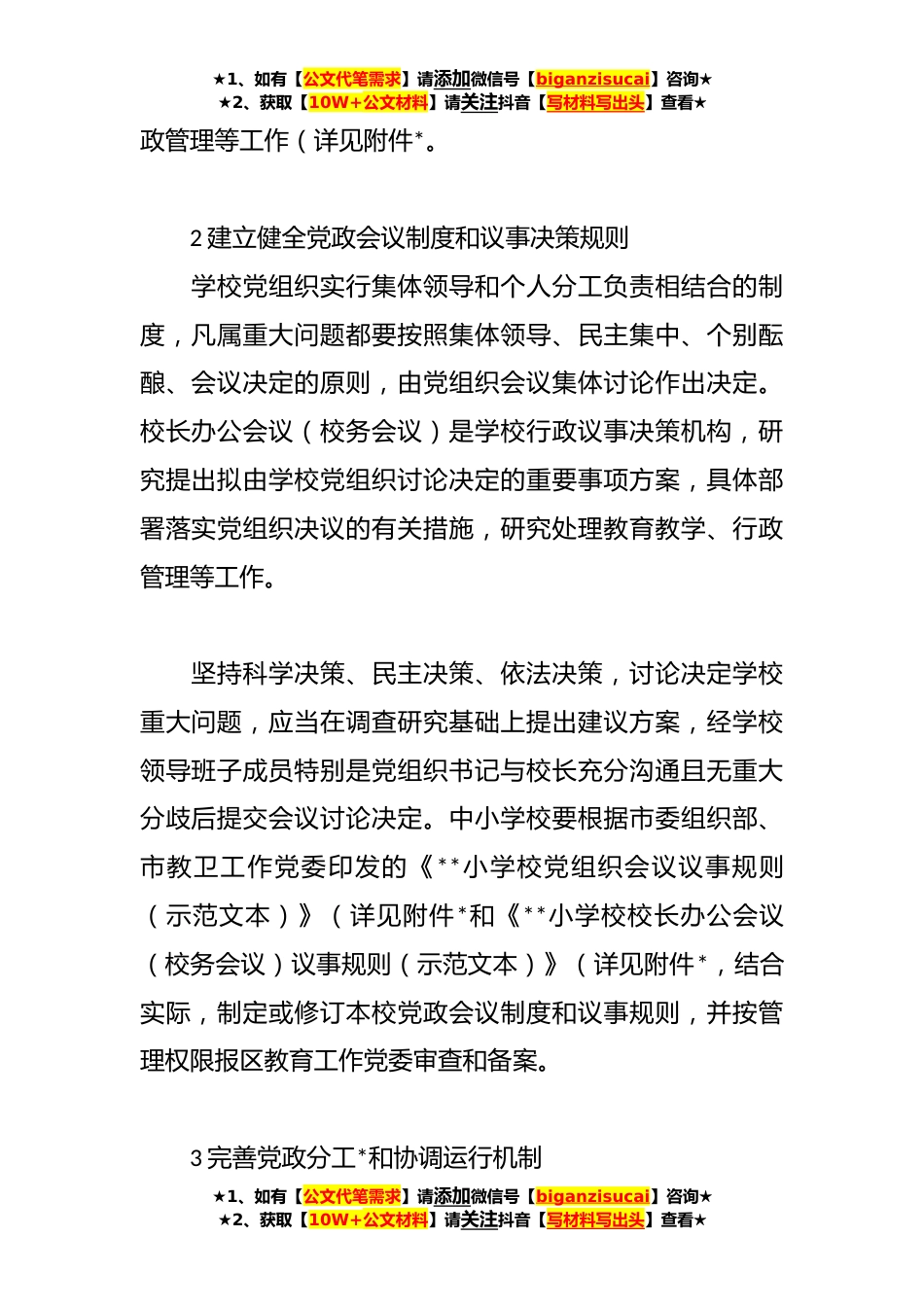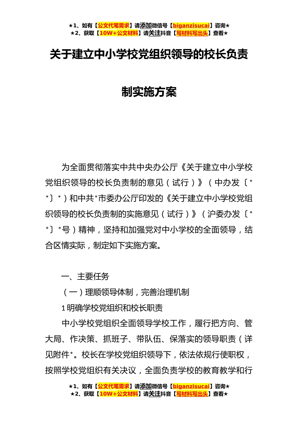 ★1、如有【公文代笔需求】请添加微信号【biganzisucai】咨询★★2、获取【10W+公文材料】请关注抖音【写材料写出头】查看★关于建立中小学校党组织领导的校长负责制实施方案为全面贯彻落实中共中央办公厅《关于建立中小学校党组织领导的校长负责制的意见(试行)》(中办发〔**〕*)和中共*市委办公厅印发的《关于建立中小学校党组织领导的校长负责制的实施意见(试行)》(沪委办发〔**〕*号)精神,坚持和加强党对中小学校的全面领导,结合区情实际,制定如下实施方案。一、主要任务(一)理顺领导体制,完善治理机制1明确学校党组织和校长职责中小学校党组织全面领导学校工作,履行把方向、管大局、作决策、抓班子、带队伍、保落实的领导职责(详见附件*。校长在学校党组织领导下,依法依规行使职权,按照学校...