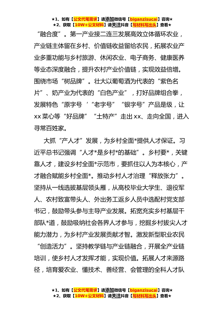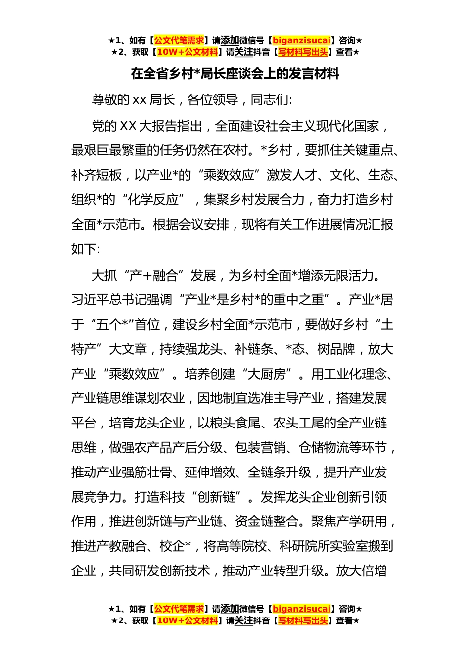 ★1、如有【公文代笔需求】请添加微信号【biganzisucai】咨询★★2、获取【10W+公文材料】请关注抖音【写材料写出头】查看★在全省乡村*局长座谈会上的发言材料尊敬的xx局长,各位领导,同志们:党的XX大报告指出,全面建设社会主义现代化国家,最艰巨最繁重的任务仍然在农村。*乡村,要抓住关键重点、补齐短板,以产业*的“乘数效应”激发人才、文化、生态、组织*的“化学反应”,集聚乡村发展合力,奋力打造乡村全面*示范市。根据会议安排,现将有关工作进展情况汇报如下:大抓“产+融合”发展,为乡村全面*增添无限活力。习近平总书记强调“产业*是乡村*的重中之重”。产业*居于“五个*”首位,建设乡村全面*示范市,要做好乡村“土特产”大文章,持续强龙头、补链条、*态、树品牌,放大产业“乘数效应”。培养创...