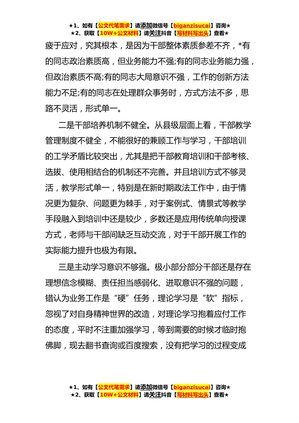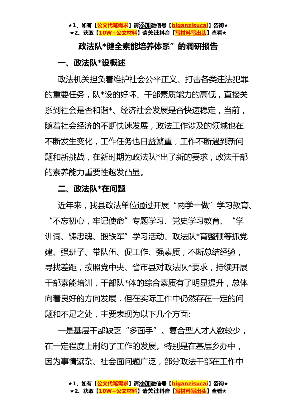 ★1、如有【公文代笔需求】请添加微信号【biganzisucai】咨询★★2、获取【10W+公文材料】请关注抖音【写材料写出头】查看★政法队*健全素能培养体系”的调研报告一、政法队*设概述政法机关担负着维护社会公平正义、打击各类违法犯罪的重要任务,队*设的好坏、干部素质能力的高低,直接关系到社会是否和谐*、经济社会发展是否快速稳定,当前,随着社会经济的不断快速发展,政法工作涉及的领域也在不断发生变化,工作任务也日益繁重,工作不断遇到新问题和新挑战,在新时期为政法队*出了新的要求,政法干部的素养能力重要性越发凸显。二、政法队*在问题近年来,我县政法单位通过开展“两学一做”学习教育、“不忘初心,牢记使命”专题学习、党史学习教育、“学训词、铸忠魂、锻铁军”学习活动、政法队*育整顿等抓党...