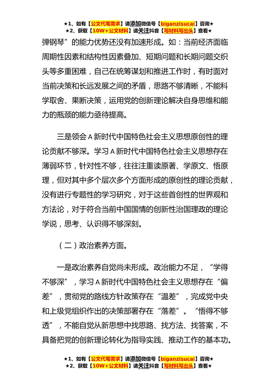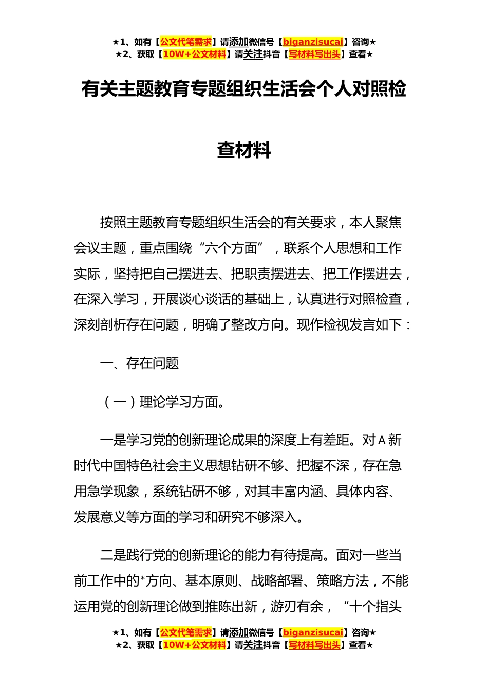 ★1、如有【公文代笔需求】请添加微信号【biganzisucai】咨询★★2、获取【10W+公文材料】请关注抖音【写材料写出头】查看★有关主题教育专题组织生活会个人对照检查材料按照主题教育专题组织生活会的有关要求,本人聚焦会议主题,重点围绕“六个方面”,联系个人思想和工作实际,坚持把自己摆进去、把职责摆进去、把工作摆进去,在深入学习,开展谈心谈话的基础上,认真进行对照检查,深刻剖析存在问题,明确了整改方向。现作检视发言如下:一、存在问题(一)理论学习方面。一是学习党的创新理论成果的深度上有差距。对A新时代中国特色社会主义思想钻研不够、把握不深,存在急用急学现象,系统钻研不够,对其丰富内涵、具体内容、发展意义等方面的学习和研究不够深入。二是践行党的创新理论的能力有待提高。面对...