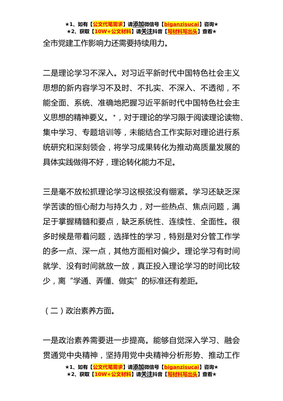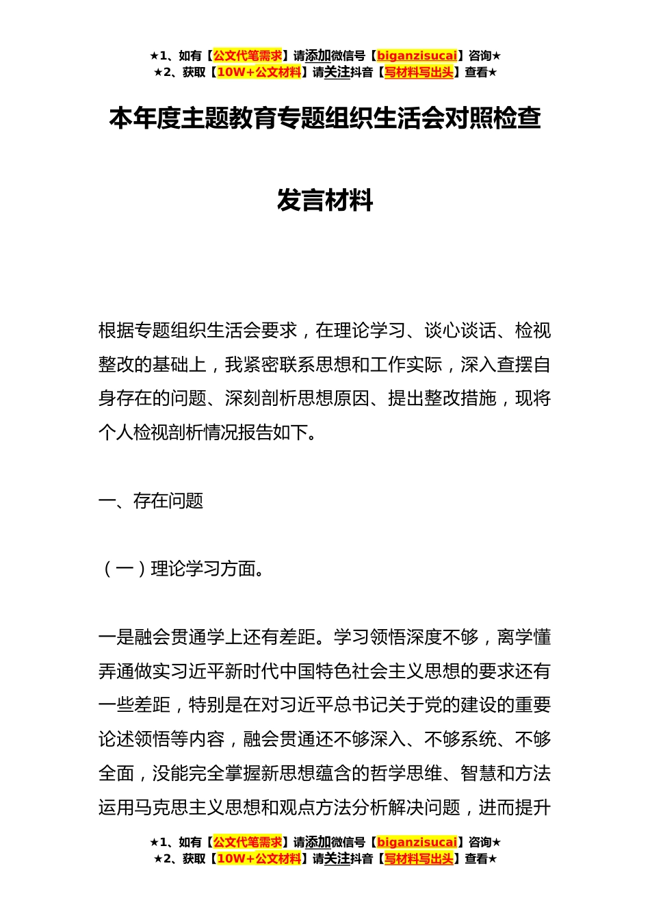 ★1、如有【公文代笔需求】请添加微信号【biganzisucai】咨询★★2、获取【10W+公文材料】请关注抖音【写材料写出头】查看★本年度主题教育专题组织生活会对照检查发言材料根据专题组织生活会要求,在理论学习、谈心谈话、检视整改的基础上,我紧密联系思想和工作实际,深入查摆自身存在的问题、深刻剖析思想原因、提出整改措施,现将个人检视剖析情况报告如下。一、存在问题(一)理论学习方面。一是融会贯通学上还有差距。学习领悟深度不够,离学懂弄通做实习近平新时代中国特色社会主义思想的要求还有一些差距,特别是在对习近平总书记关于党的建设的重要论述领悟等内容,融会贯通还不够深入、不够系统、不够全面,没能完全掌握新思想蕴含的哲学思维、智慧和方法运用马克思主义思想和观点方法分析解决问题,进...