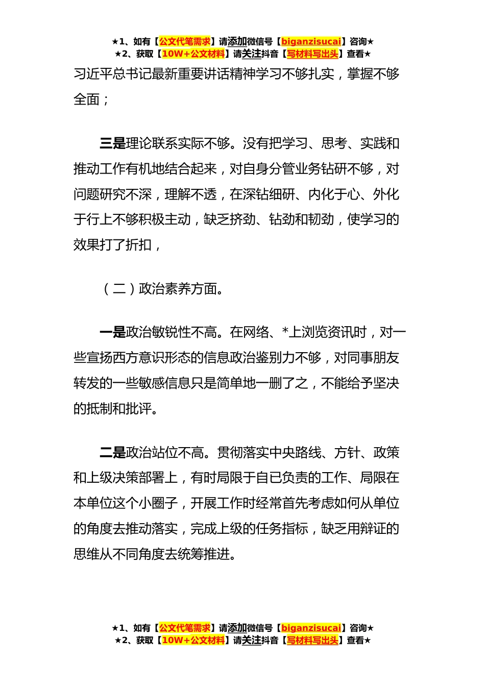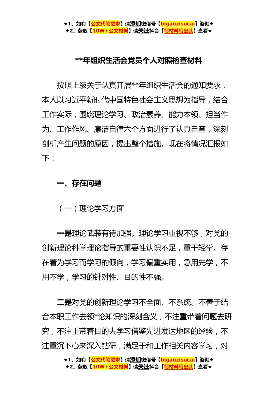 ★1、如有【公文代笔需求】请添加微信号【biganzisucai】咨询★★2、获取【10W+公文材料】请关注抖音【写材料写出头】查看★**年组织生活会党员个人对照检查材料按照上级关于认真开展**年组织生活会的通知要求,本人以习近平新时代中国特色社会主义思想为指导,结合工作实际,围绕理论学习、政治素养、能力本领、担当作为、工作作风、廉洁自律六个方面进行了认真自查,深刻剖析产生问题的原因,提出整个措施。现在将情况汇报如下:一、存在问题(一)理论学习方面一是理论武装有待加强。理论学习重视不够,对党的创新理论科学理论指导的重要性认识不足,重干轻学。存在着为学习而学习的倾向,学习偏重实用,急用先学,不用不学,学习的针对性、目的性不强。二是对党的创新理论学习不全面、不系统。不善于结合本职...