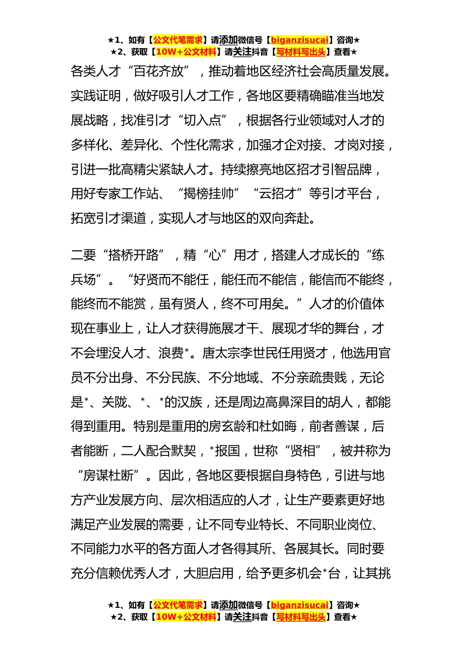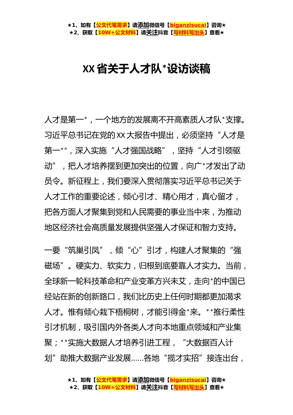 ★1、如有【公文代笔需求】请添加微信号【biganzisucai】咨询★★2、获取【10W+公文材料】请关注抖音【写材料写出头】查看★XX省关于人才队*设访谈稿人才是第一*,一个地方的发展离不开高素质人才队*支撑。习近平总书记在党的XX大报告中提出,必须坚持“人才是第一*”,深入实施“人才强国战略”,坚持“人才引领驱动”,把人才培养摆到更加突出的位置,向广*才发出了动员令。新征程上,我们要深入贯彻落实习近平总书记关于人才工作的重要论述,倾心引才、精心用才,真心留才,把各方面人才聚集到党和人民需要的事业当中来,为推动地区经济社会高质量发展提供坚强人才保证和智力支持。一要“筑巢引凤”,倾“心”引才,构建人才聚集的“强磁场”。硬实力、软实力,归根到底要靠人才实力。当前,全球新一轮科技革命...