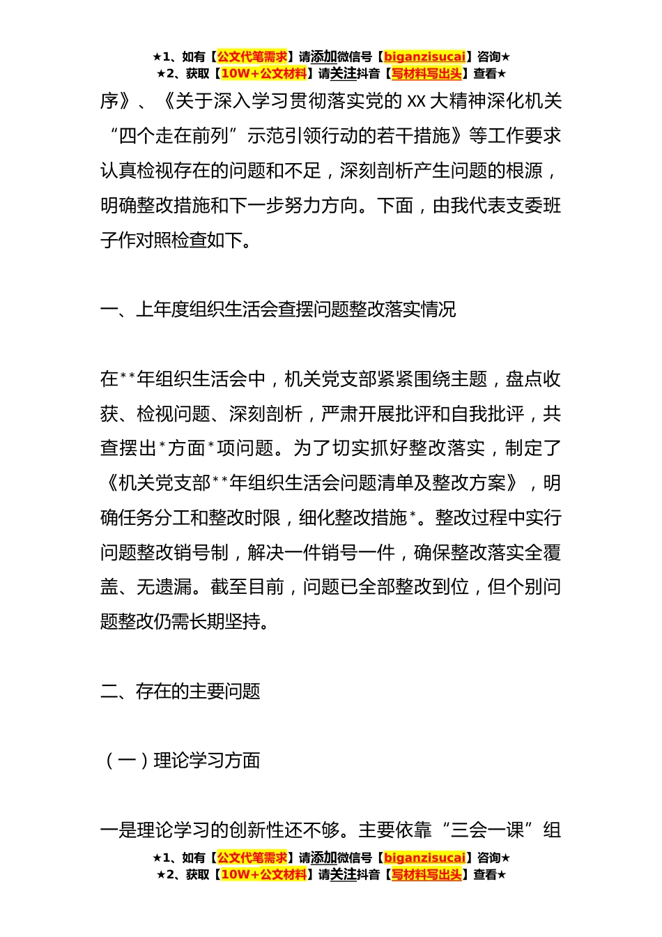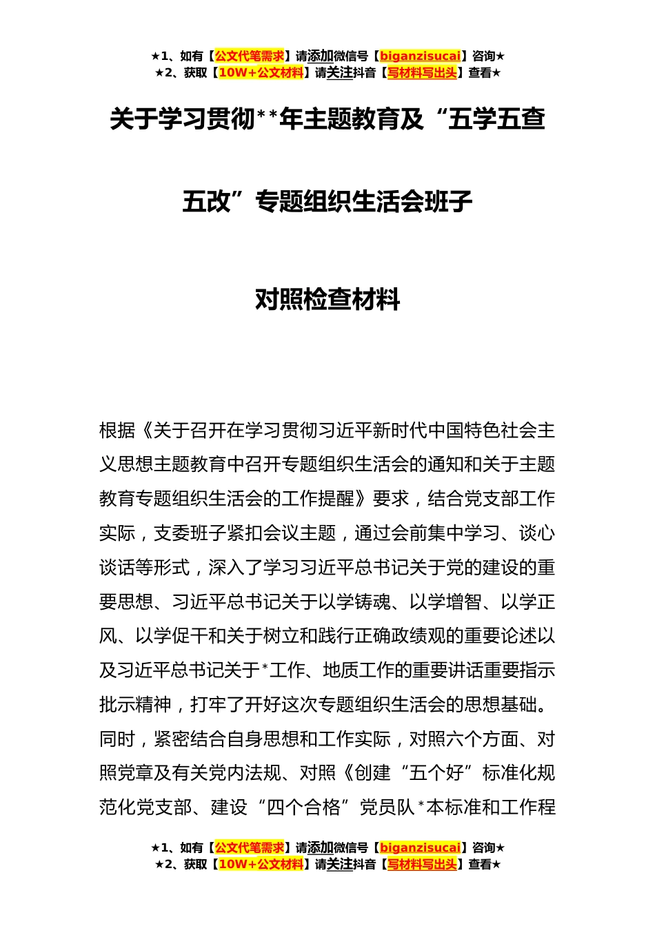 ★1、如有【公文代笔需求】请添加微信号【biganzisucai】咨询★★2、获取【10W+公文材料】请关注抖音【写材料写出头】查看★关于学习贯彻**年主题教育及“五学五查五改”专题组织生活会班子对照检查材料根据《关于召开在学习贯彻习近平新时代中国特色社会主义思想主题教育中召开专题组织生活会的通知和关于主题教育专题组织生活会的工作提醒》要求,结合党支部工作实际,支委班子紧扣会议主题,通过会前集中学习、谈心谈话等形式,深入了学习习近平总书记关于党的建设的重要思想、习近平总书记关于以学铸魂、以学增智、以学正风、以学促干和关于树立和践行正确政绩观的重要论述以及习近平总书记关于*工作、地质工作的重要讲话重要指示批示精神,打牢了开好这次专题组织生活会的思想基础。同时,紧密结合自身思想和...