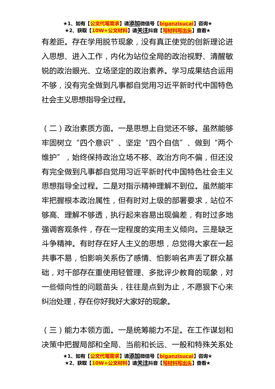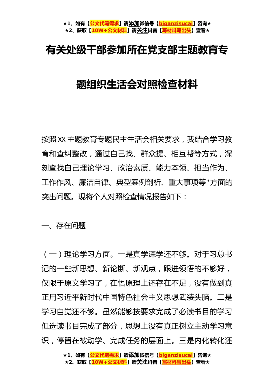 ★1、如有【公文代笔需求】请添加微信号【biganzisucai】咨询★★2、获取【10W+公文材料】请关注抖音【写材料写出头】查看★有关处级干部参加所在党支部主题教育专题组织生活会对照检查材料按照XX主题教育专题民主生活会相关要求,我结合学习教育和查纠整改,通过自己找、群众提、相互帮等方式,深刻查找自己理论学习、政治素质、能力本领、担当作为、工作作风、廉洁自律、典型案例剖析、重大事项等*方面的突出问题。现将个人对照检查情况报告如下:一、存在问题(一)理论学习方面。一是真学深学还不够。对于习总书记的一些新思想、新论断、新观点,跟进领悟的不够好,仅限于原文学习了,在悟原理上还存在不足,没有做到真正用习近平新时代中国特色社会主义思想武装头脑。二是学习自觉还不够。虽然能够按要求完成...