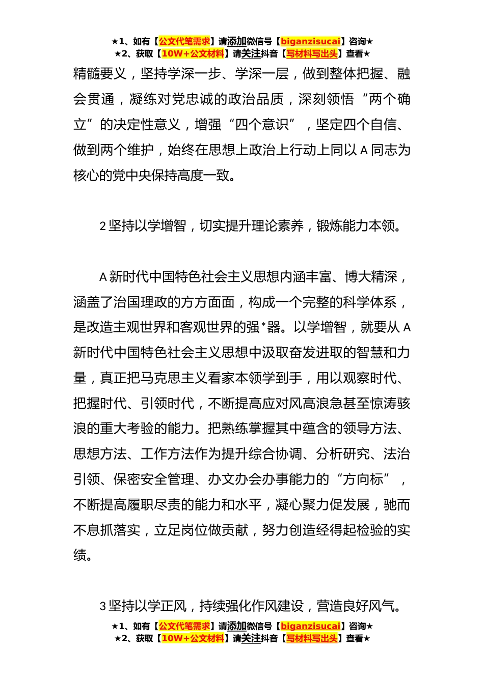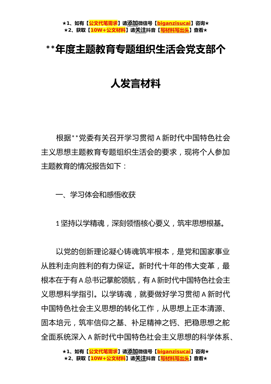 ★1、如有【公文代笔需求】请添加微信号【biganzisucai】咨询★★2、获取【10W+公文材料】请关注抖音【写材料写出头】查看★**年度主题教育专题组织生活会党支部个人发言材料根据**党委有关召开学习贯彻A新时代中国特色社会主义思想主题教育专题组织生活会的要求,现将个人参加主题教育的情况报告如下:一、学习体会和感悟收获1坚持以学精魂,深刻领悟核心要义,筑牢思想根基。以党的创新理论凝心铸魂筑牢根本,是党和国家事业从胜利走向胜利的有力保证。新时代十年的伟大变革,最根本在于有A总书记掌舵领航,有A新时代中国特色社会主义思想科学指引。以学铸魂,就要做好学习贯彻A新时代中国特色社会主义思想的转化工作,从思想上正本清源、固本培元,筑牢信仰之基、补足精神之钙、把稳思想之舵全面系统深入A新时...