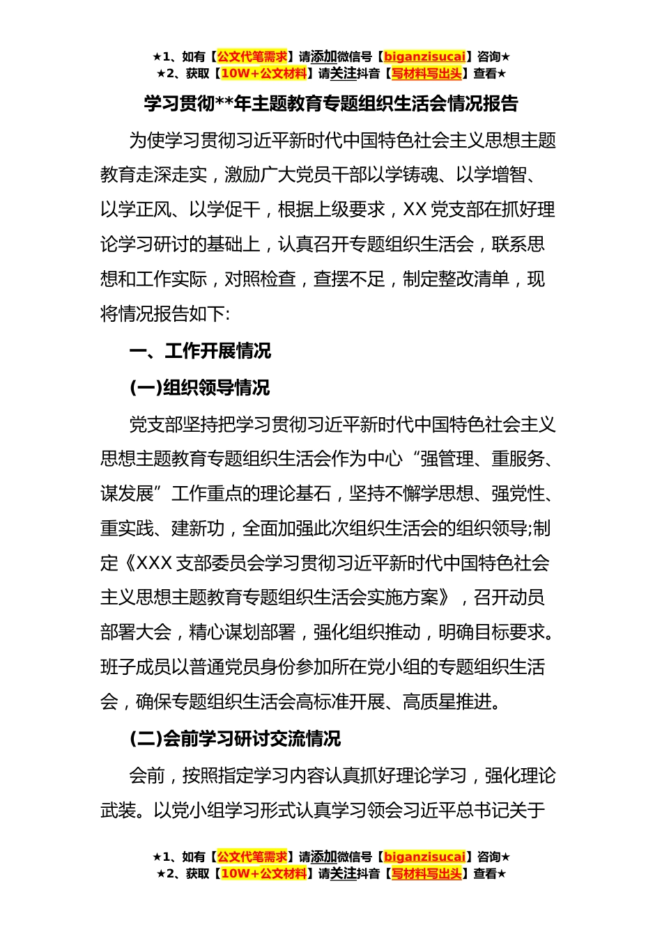 ★1、如有【公文代笔需求】请添加微信号【biganzisucai】咨询★★2、获取【10W+公文材料】请关注抖音【写材料写出头】查看★学习贯彻**年主题教育专题组织生活会情况报告为使学习贯彻习近平新时代中国特色社会主义思想主题教育走深走实,激励广大党员干部以学铸魂、以学增智、以学正风、以学促干,根据上级要求,XX党支部在抓好理论学习研讨的基础上,认真召开专题组织生活会,联系思想和工作实际,对照检查,查摆不足,制定整改清单,现将情况报告如下:一、工作开展情况(一)组织领导情况党支部坚持把学习贯彻习近平新时代中国特色社会主义思想主题教育专题组织生活会作为中心“强管理、重服务、谋发展”工作重点的理论基石,坚持不懈学思想、强党性、重实践、建新功,全面加强此次组织生活会的组织领导;制定《XXX...