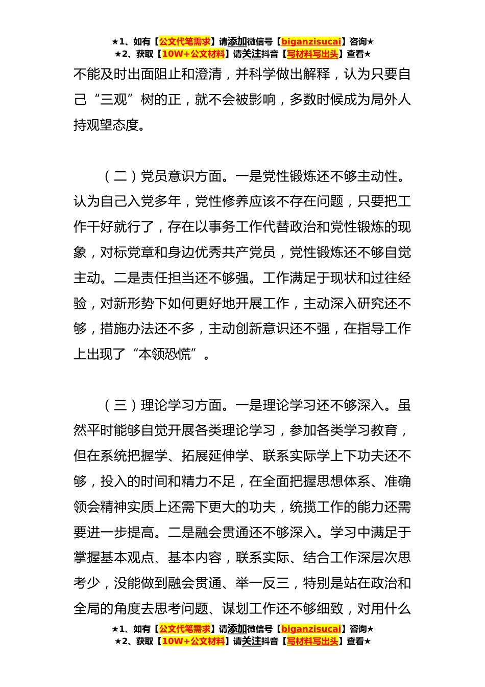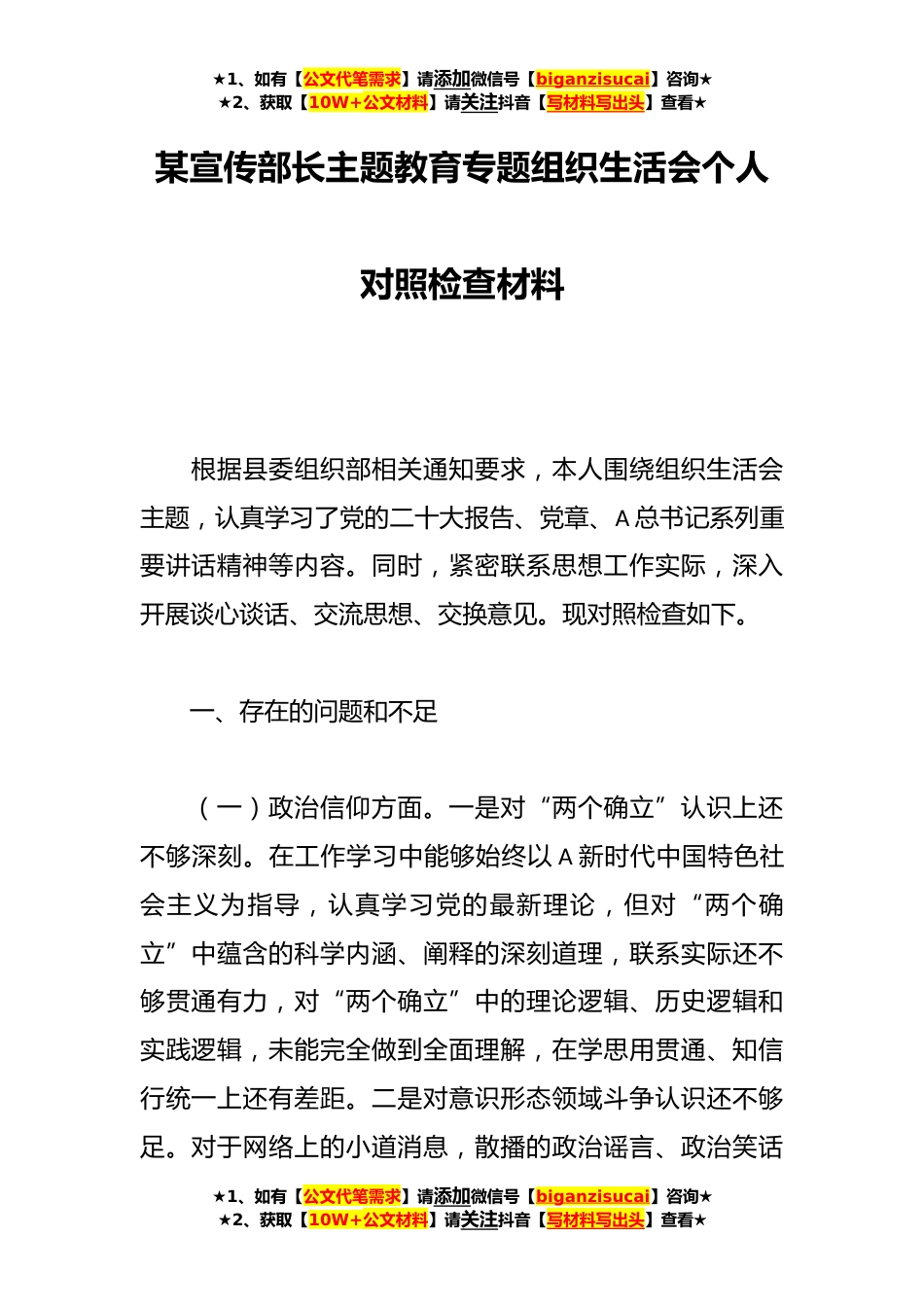 ★1、如有【公文代笔需求】请添加微信号【biganzisucai】咨询★★2、获取【10W+公文材料】请关注抖音【写材料写出头】查看★某宣传部长主题教育专题组织生活会个人对照检查材料根据县委组织部相关通知要求,本人围绕组织生活会主题,认真学习了党的二十大报告、党章、A总书记系列重要讲话精神等内容。同时,紧密联系思想工作实际,深入开展谈心谈话、交流思想、交换意见。现对照检查如下。一、存在的问题和不足(一)政治信仰方面。一是对“两个确立”认识上还不够深刻。在工作学习中能够始终以A新时代中国特色社会主义为指导,认真学习党的最新理论,但对“两个确立”中蕴含的科学内涵、阐释的深刻道理,联系实际还不够贯通有力,对“两个确立”中的理论逻辑、历史逻辑和实践逻辑,未能完全做到全面理解,在学思...