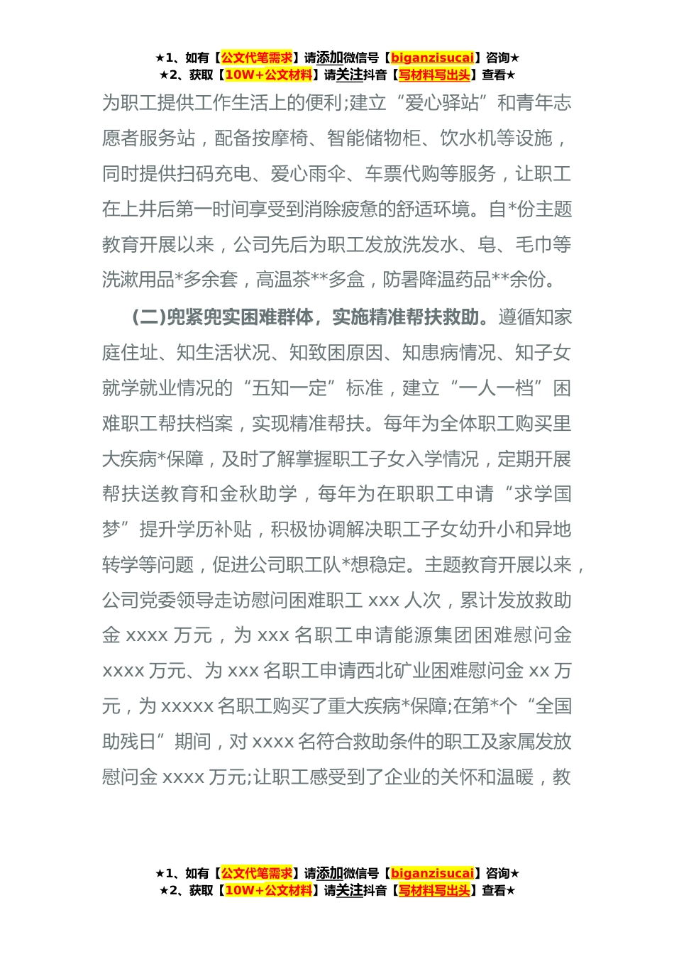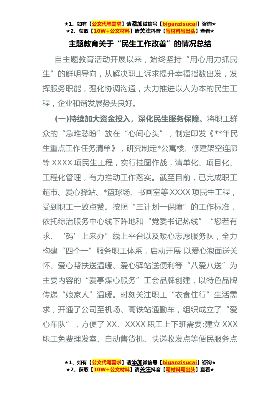 ★1、如有【公文代笔需求】请添加微信号【biganzisucai】咨询★★2、获取【10W+公文材料】请关注抖音【写材料写出头】查看★主题教育关于“民生工作改善”的情况总结自主题教育活动开展以来,始终坚持“用心用力抓民生”的鲜明导向,从解决职工诉求提升幸福指数出发,发挥服务职能,强化协调沟通,大力推进以人为本的民生工程,企业和谐发展势头良好。(一)持续加大资金投入,深化民生服务保障。将职工群众的“急难愁盼”放在“心间心头”,制定印发《**年民生重点工作任务清单》,研究制定*公寓楼、修建架空连廊等XXXX项民生工程,实行挂图作战,清单化、项目化、工程化管理,有力推动工作落实。截至目前,已完成职工超市、爱心驿站、*篮球场、书画室等XXXX项民生工程,受到职工一致点赞。按照“三计划一保障”的...
