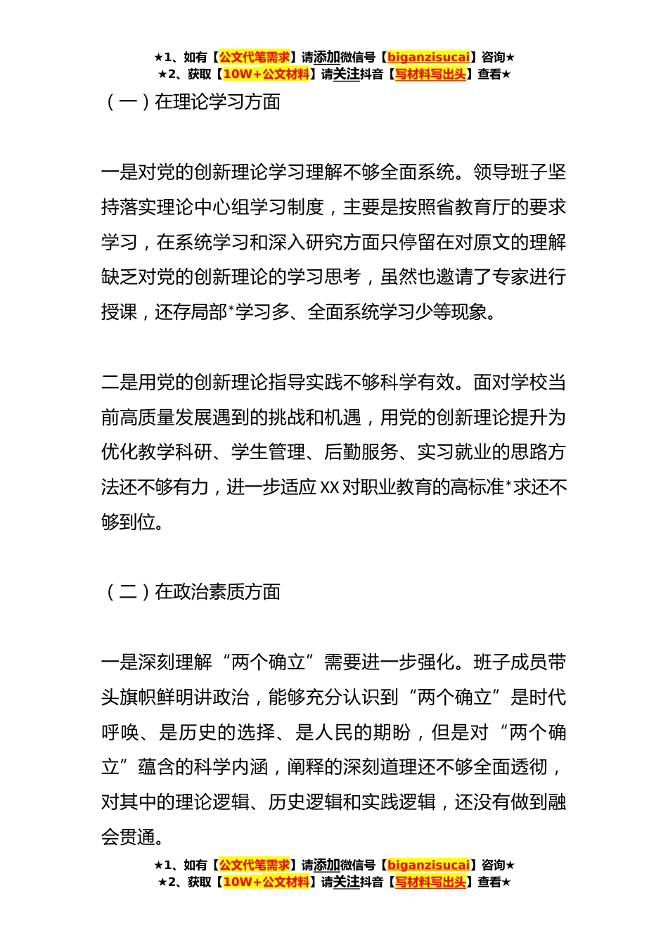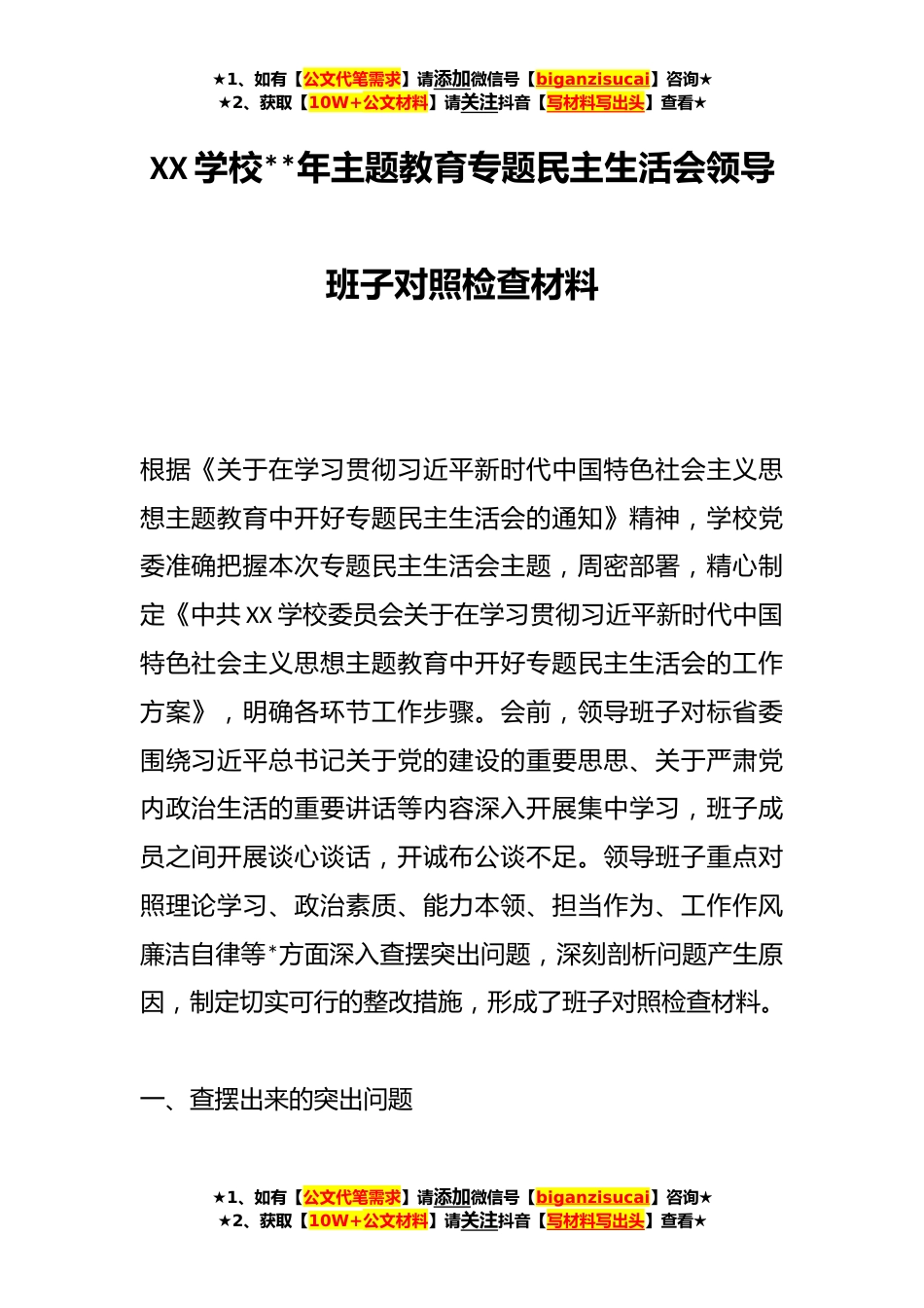 ★1、如有【公文代笔需求】请添加微信号【biganzisucai】咨询★★2、获取【10W+公文材料】请关注抖音【写材料写出头】查看★XX学校**年主题教育专题民主生活会领导班子对照检查材料根据《关于在学习贯彻习近平新时代中国特色社会主义思想主题教育中开好专题民主生活会的通知》精神,学校党委准确把握本次专题民主生活会主题,周密部署,精心制定《中共XX学校委员会关于在学习贯彻习近平新时代中国特色社会主义思想主题教育中开好专题民主生活会的工作方案》,明确各环节工作步骤。会前,领导班子对标省委围绕习近平总书记关于党的建设的重要思思、关于严肃党内政治生活的重要讲话等内容深入开展集中学习,班子成员之间开展谈心谈话,开诚布公谈不足。领导班子重点对照理论学习、政治素质、能力本领、担当作为、工...