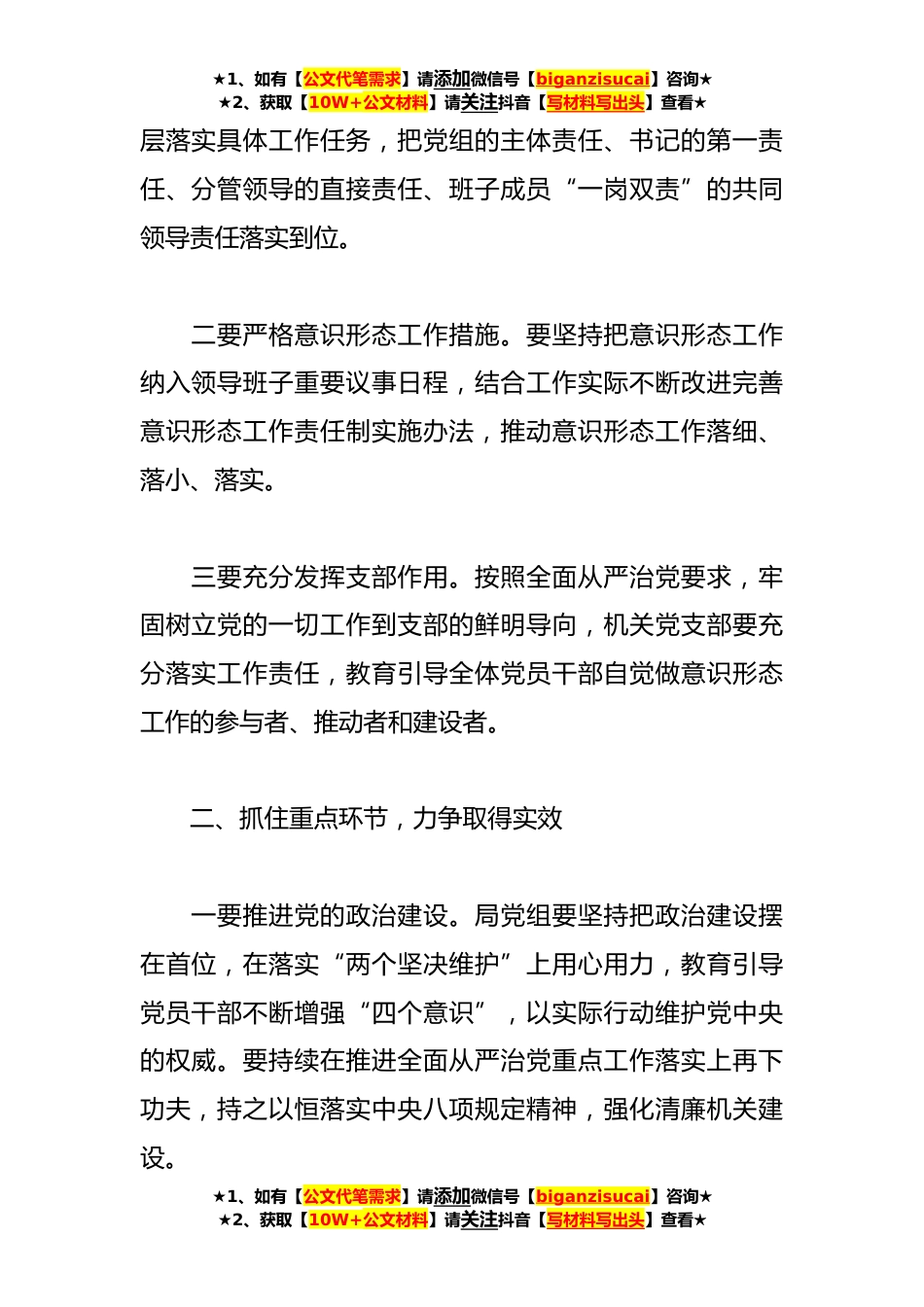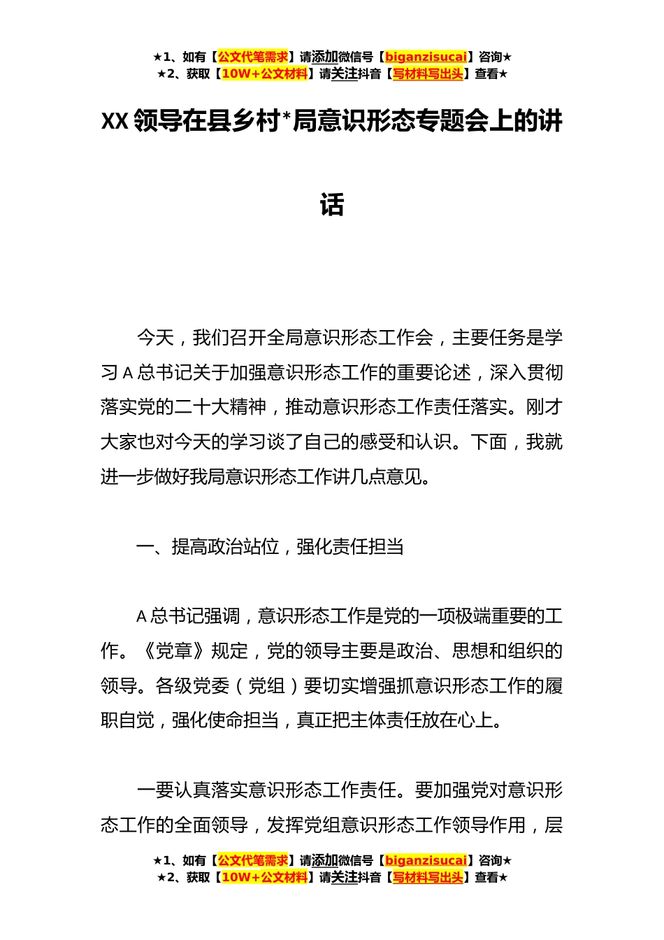 ★1、如有【公文代笔需求】请添加微信号【biganzisucai】咨询★★2、获取【10W+公文材料】请关注抖音【写材料写出头】查看★XX领导在县乡村*局意识形态专题会上的讲话今天,我们召开全局意识形态工作会,主要任务是学习A总书记关于加强意识形态工作的重要论述,深入贯彻落实党的二十大精神,推动意识形态工作责任落实。刚才大家也对今天的学习谈了自己的感受和认识。下面,我就进一步做好我局意识形态工作讲几点意见。一、提高政治站位,强化责任担当A总书记强调,意识形态工作是党的一项极端重要的工作。《党章》规定,党的领导主要是政治、思想和组织的领导。各级党委(党组)要切实增强抓意识形态工作的履职自觉,强化使命担当,真正把主体责任放在心上。一要认真落实意识形态工作责任。要加强党对意识形态工作...