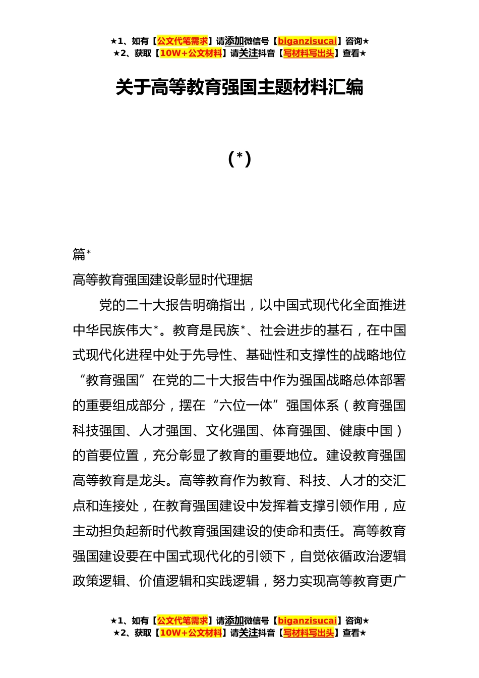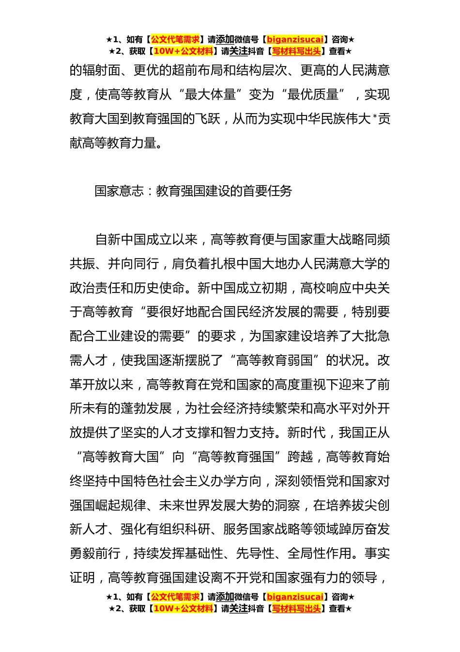 ★1、如有【公文代笔需求】请添加微信号【biganzisucai】咨询★★2、获取【10W+公文材料】请关注抖音【写材料写出头】查看★关于高等教育强国主题材料汇编(*)篇*高等教育强国建设彰显时代理据党的二十大报告明确指出,以中国式现代化全面推进中华民族伟大*。教育是民族*、社会进步的基石,在中国式现代化进程中处于先导性、基础性和支撑性的战略地位“教育强国”在党的二十大报告中作为强国战略总体部署的重要组成部分,摆在“六位一体”强国体系(教育强国科技强国、人才强国、文化强国、体育强国、健康中国)的首要位置,充分彰显了教育的重要地位。建设教育强国高等教育是龙头。高等教育作为教育、科技、人才的交汇点和连接处,在教育强国建设中发挥着支撑引领作用,应主动担负起新时代教育强国建设的使命和...