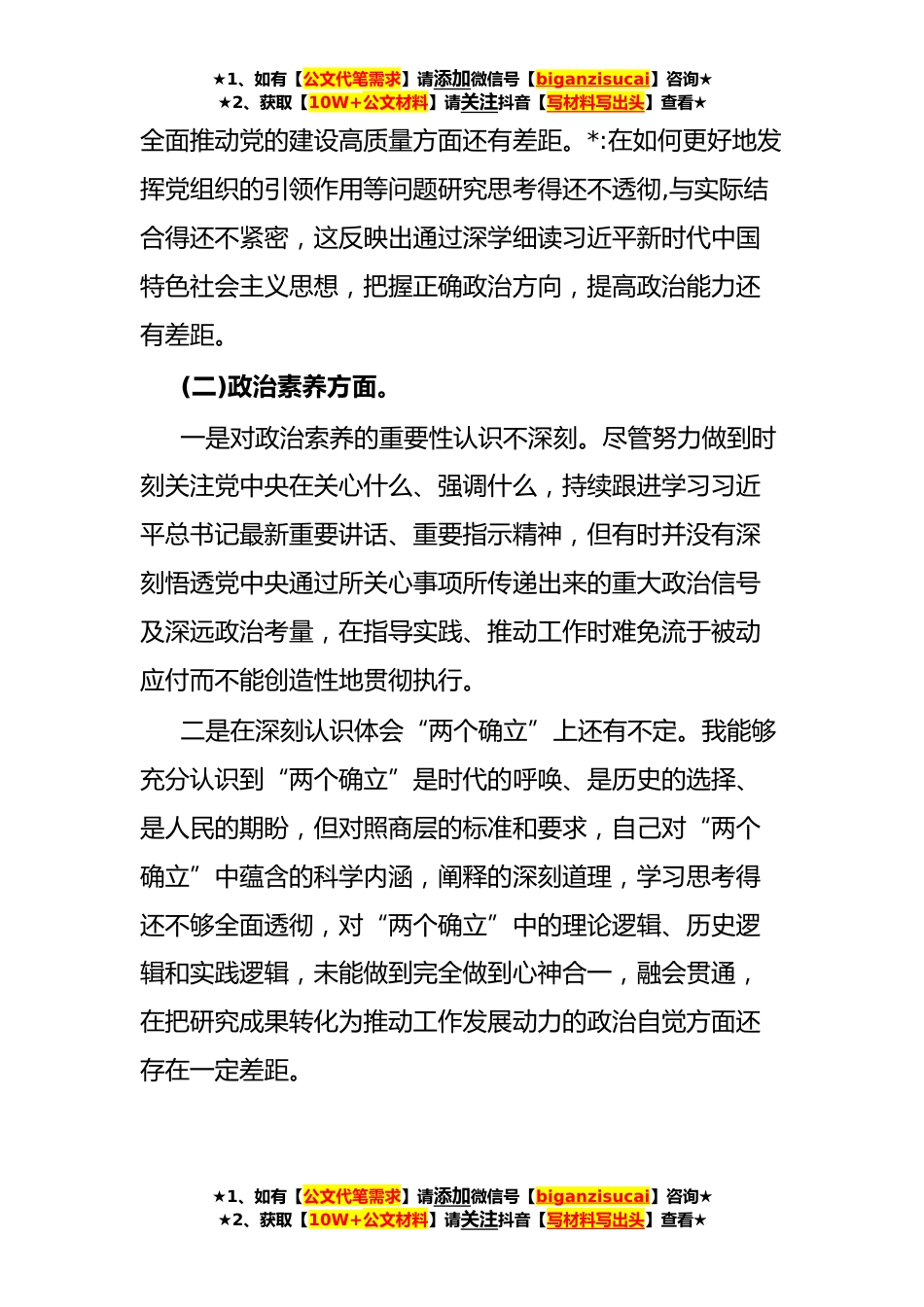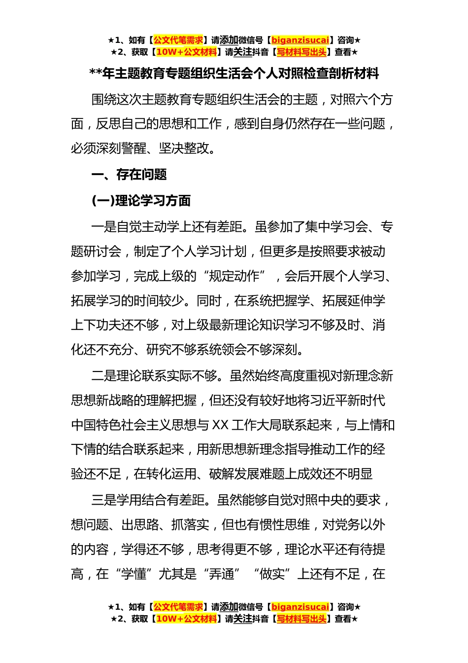 ★1、如有【公文代笔需求】请添加微信号【biganzisucai】咨询★★2、获取【10W+公文材料】请关注抖音【写材料写出头】查看★**年主题教育专题组织生活会个人对照检查剖析材料围绕这次主题教育专题组织生活会的主题,对照六个方面,反思自己的思想和工作,感到自身仍然存在一些问题,必须深刻警醒、坚决整改。一、存在问题(一)理论学习方面一是自觉主动学上还有差距。虽参加了集中学习会、专题研讨会,制定了个人学习计划,但更多是按照要求被动参加学习,完成上级的“规定动作”,会后开展个人学习、拓展学习的时间较少。同时,在系统把握学、拓展延伸学上下功夫还不够,对上级最新理论知识学习不够及时、消化还不充分、研究不够系统领会不够深刻。二是理论联系实际不够。虽然始终高度重视对新理念新思想新战略的...