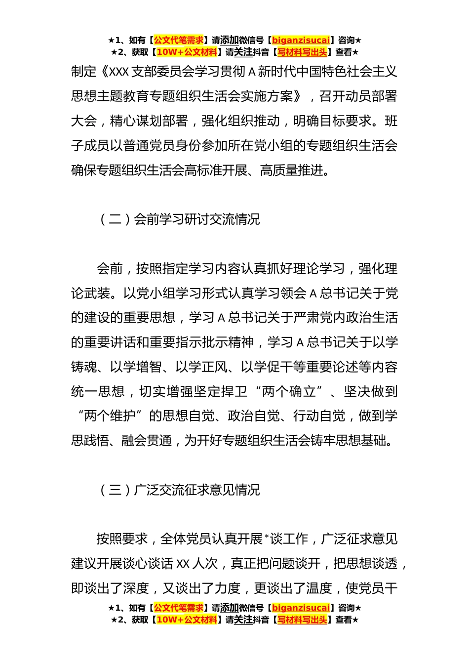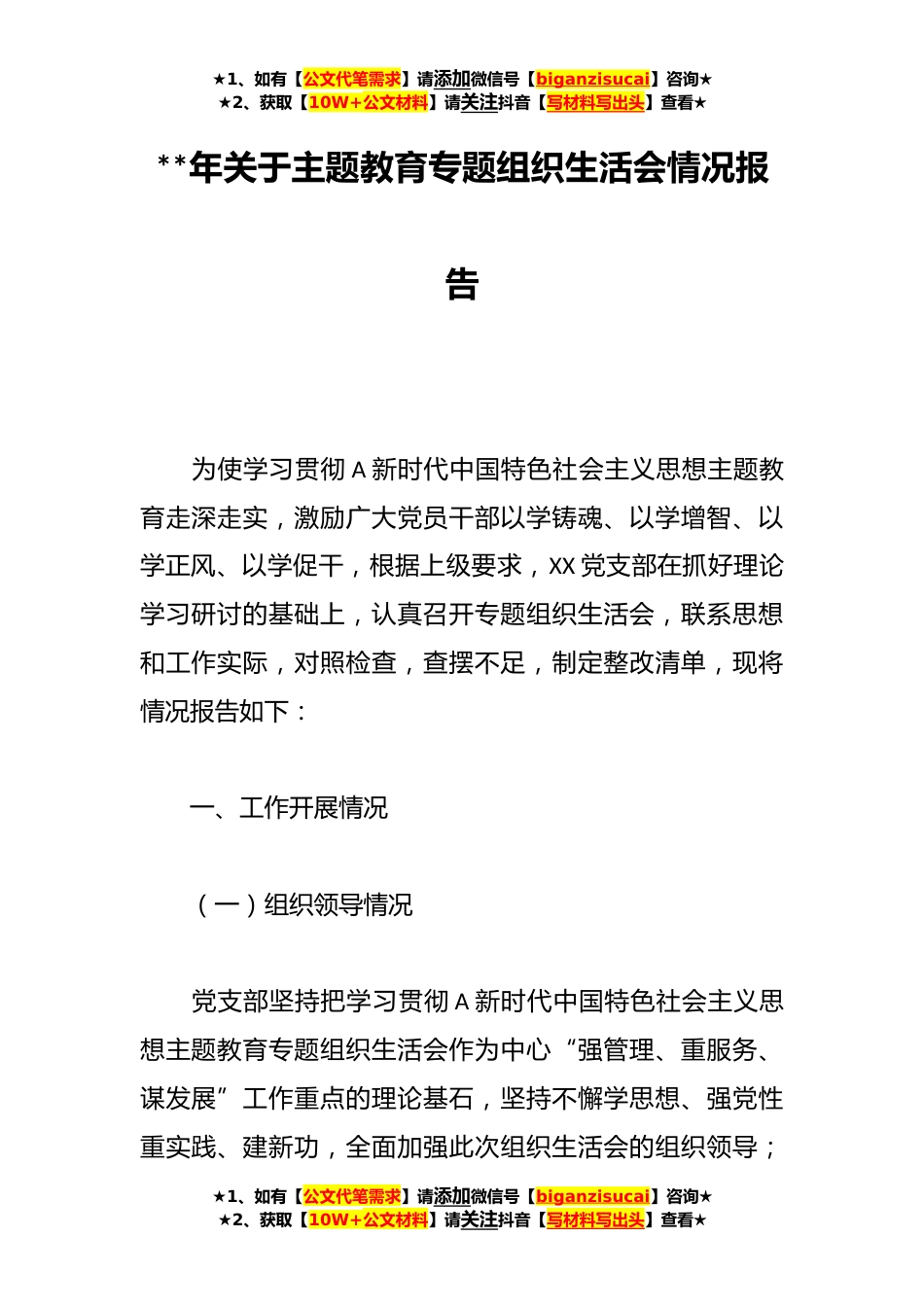 ★1、如有【公文代笔需求】请添加微信号【biganzisucai】咨询★★2、获取【10W+公文材料】请关注抖音【写材料写出头】查看★**年关于主题教育专题组织生活会情况报告为使学习贯彻A新时代中国特色社会主义思想主题教育走深走实,激励广大党员干部以学铸魂、以学增智、以学正风、以学促干,根据上级要求,XX党支部在抓好理论学习研讨的基础上,认真召开专题组织生活会,联系思想和工作实际,对照检查,查摆不足,制定整改清单,现将情况报告如下:一、工作开展情况(一)组织领导情况党支部坚持把学习贯彻A新时代中国特色社会主义思想主题教育专题组织生活会作为中心“强管理、重服务、谋发展”工作重点的理论基石,坚持不懈学思想、强党性重实践、建新功,全面加强此次组织生活会的组织领导;★1、如有【公文代笔需...
