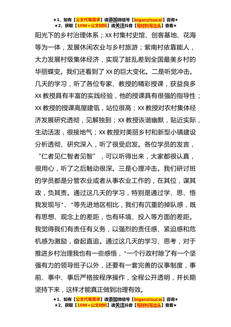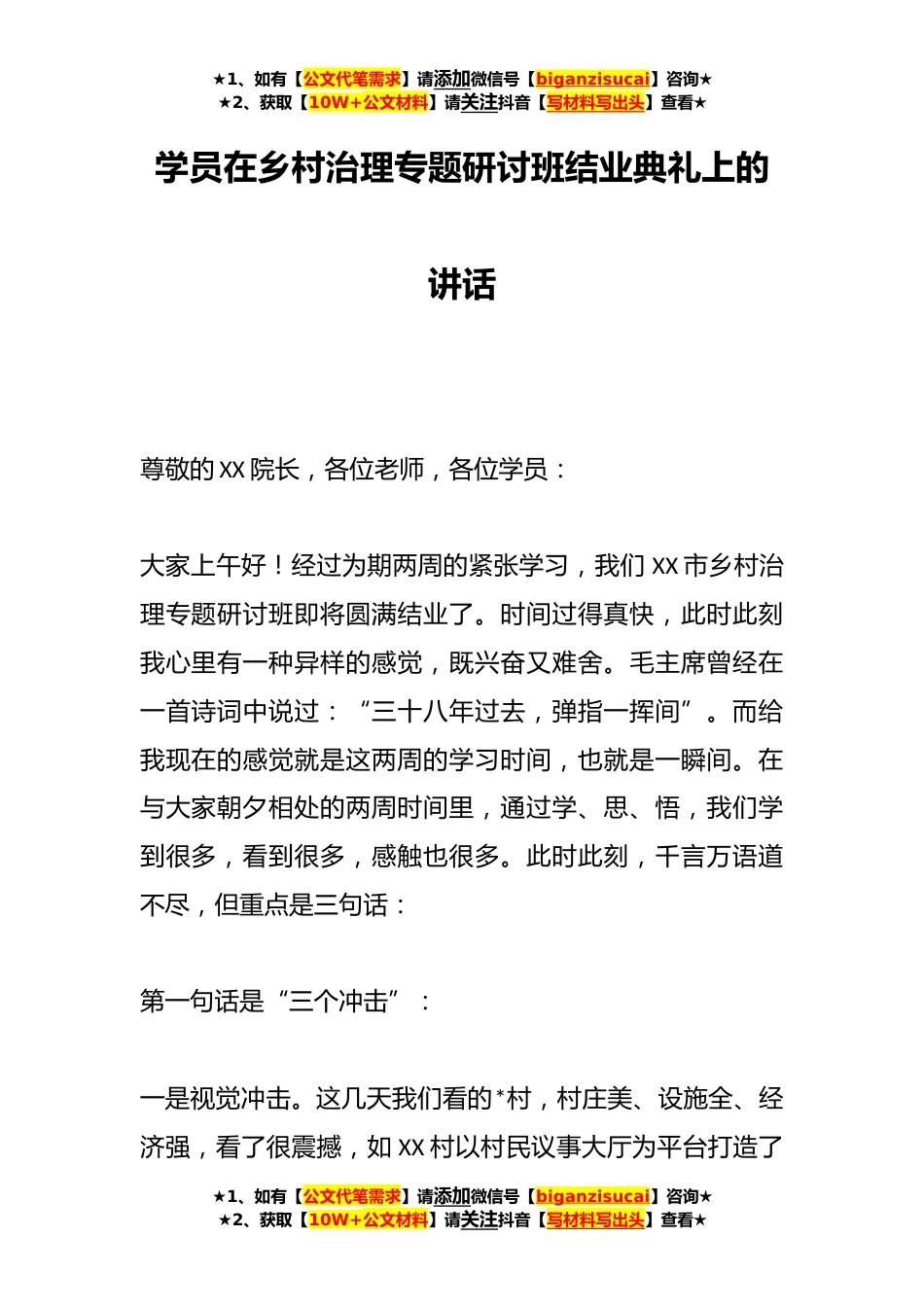 ★1、如有【公文代笔需求】请添加微信号【biganzisucai】咨询★★2、获取【10W+公文材料】请关注抖音【写材料写出头】查看★学员在乡村治理专题研讨班结业典礼上的讲话尊敬的XX院长,各位老师,各位学员:大家上午好!经过为期两周的紧张学习,我们XX市乡村治理专题研讨班即将圆满结业了。时间过得真快,此时此刻我心里有一种异样的感觉,既兴奋又难舍。毛主席曾经在一首诗词中说过:“三十八年过去,弹指一挥间”。而给我现在的感觉就是这两周的学习时间,也就是一瞬间。在与大家朝夕相处的两周时间里,通过学、思、悟,我们学到很多,看到很多,感触也很多。此时此刻,千言万语道不尽,但重点是三句话:第一句话是“三个冲击”:一是视觉冲击。这几天我们看的*村,村庄美、设施全、经济强,看了很震撼,如XX村以...