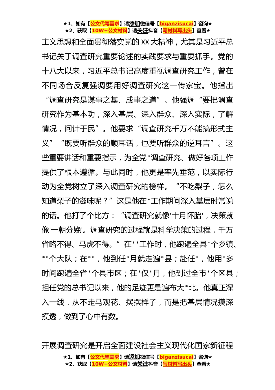 ★1、如有【公文代笔需求】请添加微信号【biganzisucai】咨询★★2、获取【10W+公文材料】请关注抖音【写材料写出头】查看★在党史办理论学习中心组调查研究专题研讨交流会上的发言材料同志们:中共中央办公厅印发的《关于在全党*调查研究的工作方案》,对于深入学习领会习近平总书记关于调查研究的重要论述,进一步增强做好调查研究的思想自觉、政治自觉行动自觉,梳理重点问题、具体问题、老大难问题,扑下身子干实事、谋实招、求实效,以高质量调查研究推动党史研究工作高质量发展,为建设中国式现代化新XX提供史鉴支撑等方面,具有十分重要的意义和价值。下面,围绕研讨发言主题,结合分管工作实际,我谈几点体会,以供同志们参考。一、深刻认识把握在全党*调查研究的重大意义和明确要求开展调查研究是深入学...