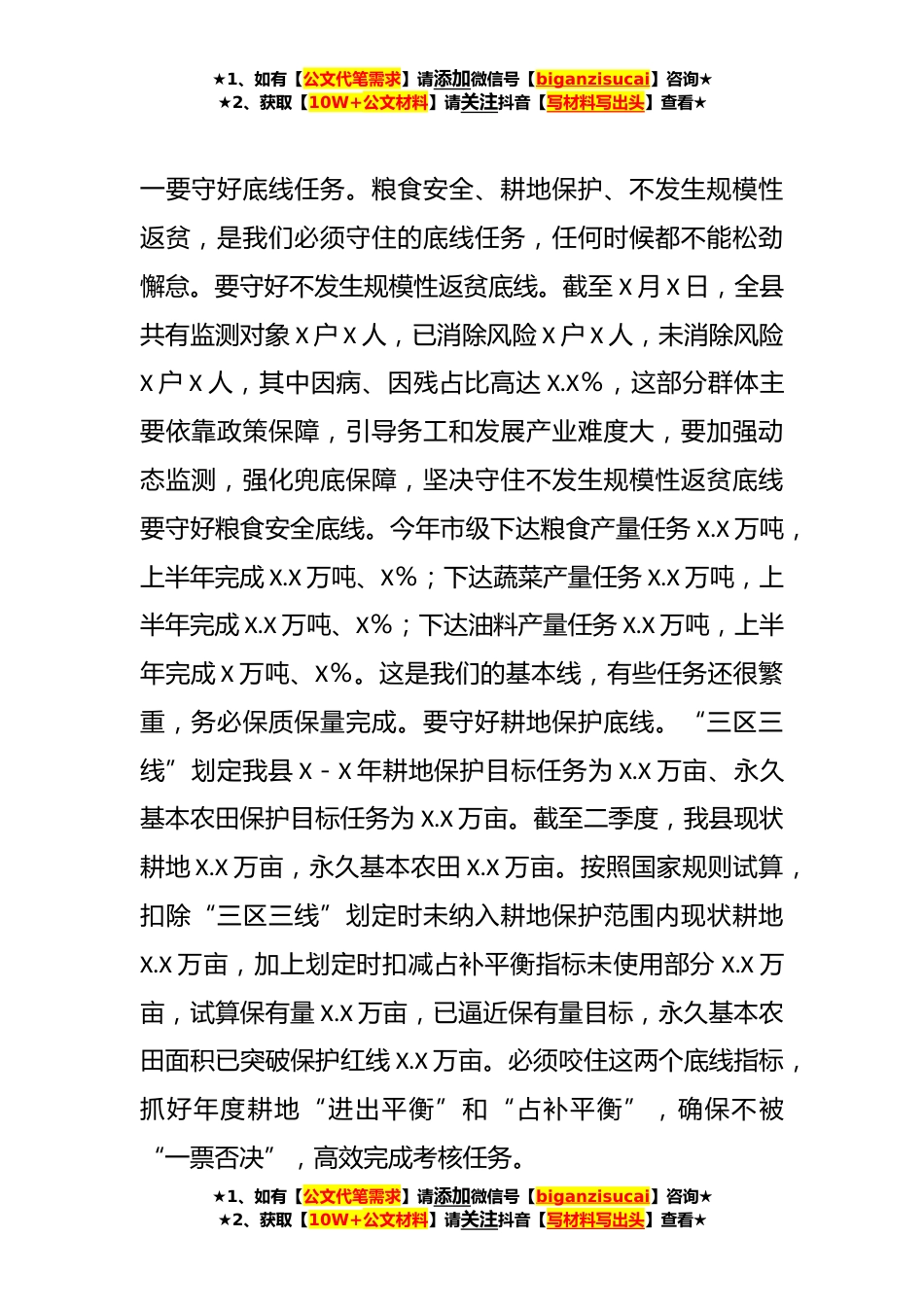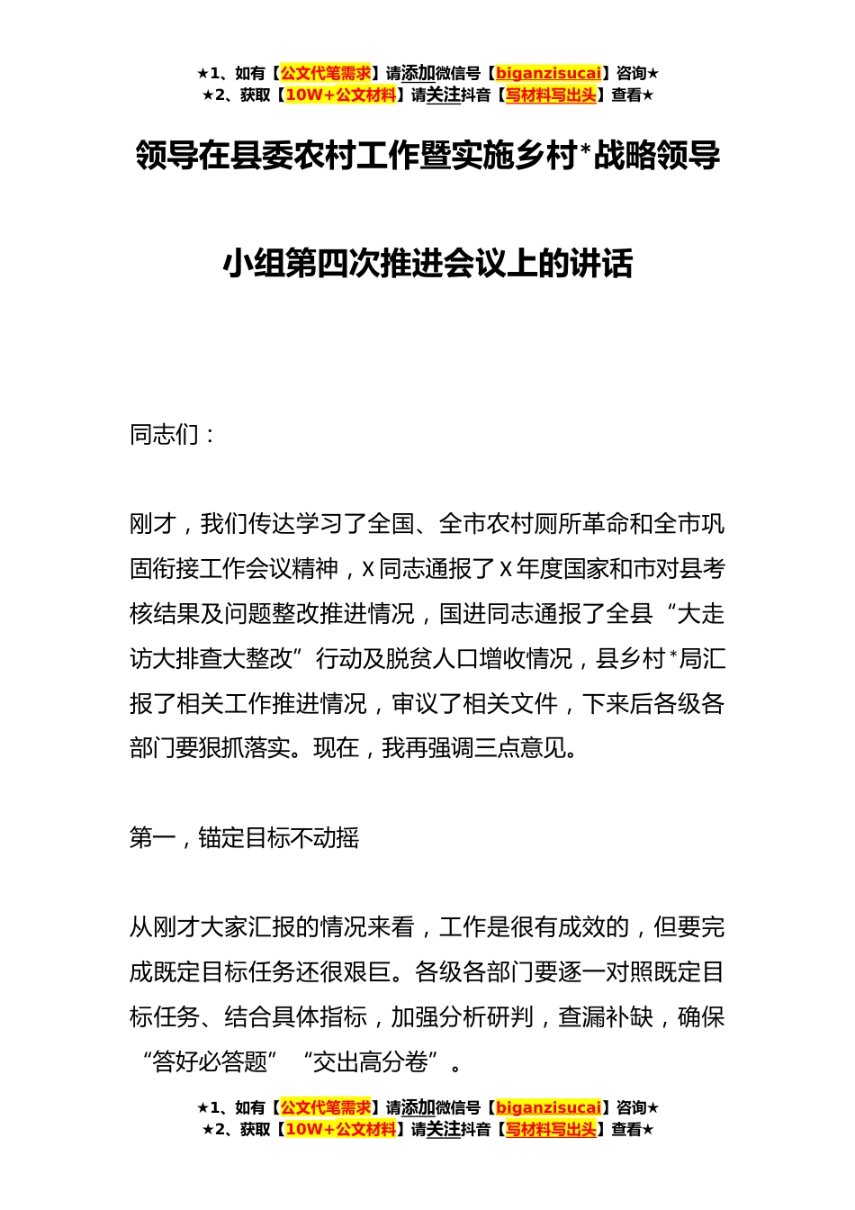 ★1、如有【公文代笔需求】请添加微信号【biganzisucai】咨询★★2、获取【10W+公文材料】请关注抖音【写材料写出头】查看★领导在县委农村工作暨实施乡村*战略领导小组第四次推进会议上的讲话同志们:刚才,我们传达学习了全国、全市农村厕所革命和全市巩固衔接工作会议精神,X同志通报了X年度国家和市对县考核结果及问题整改推进情况,国进同志通报了全县“大走访大排查大整改”行动及脱贫人口增收情况,县乡村*局汇报了相关工作推进情况,审议了相关文件,下来后各级各部门要狠抓落实。现在,我再强调三点意见。第一,锚定目标不动摇从刚才大家汇报的情况来看,工作是很有成效的,但要完成既定目标任务还很艰巨。各级各部门要逐一对照既定目标任务、结合具体指标,加强分析研判,查漏补缺,确保“答好必答题”...