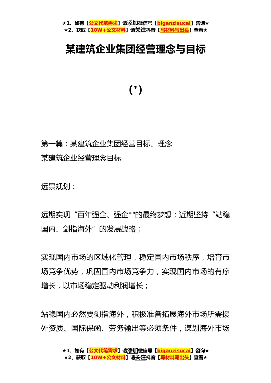 ★1、如有【公文代笔需求】请添加微信号【biganzisucai】咨询★★2、获取【10W+公文材料】请关注抖音【写材料写出头】查看★某建筑企业集团经营理念与目标(*)第一篇:某建筑企业集团经营目标、理念某建筑企业经营理念目标远景规划:远期实现“百年强企、强企*”的最终梦想;近期坚持“站稳国内、剑指海外”的发展战略;实现国内市场的区域化管理,稳定国内市场秩序,培育市场竞争优势,巩固国内市场竞争力,实现国内市场的有序增长,以市场稳定驱动利润增长;站稳国内必然要剑指海外,积极准备拓展海外市场所需援外资质、国际保函、劳务输出等必须条件,谋划海外市场★1、如有【公文代笔需求】请添加微信号【biganzisucai】咨询★★2、获取【10W+公文材料】请关注抖音【写材料写出头】查看★★1、如有【公文代笔...