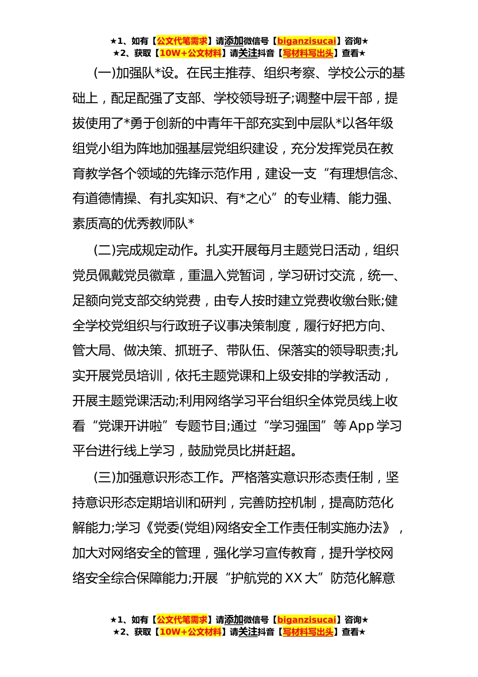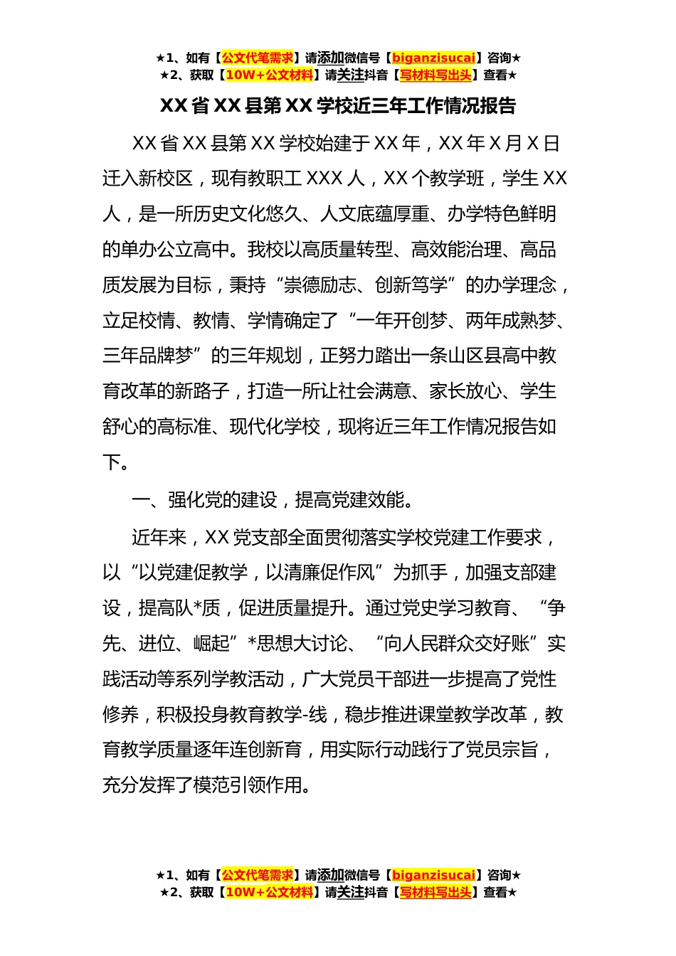 ★1、如有【公文代笔需求】请添加微信号【biganzisucai】咨询★★2、获取【10W+公文材料】请关注抖音【写材料写出头】查看★XX省XX县第XX学校近三年工作情况报告XX省XX县第XX学校始建于XX年,XX年X月X日迁入新校区,现有教职工XXX人,XX个教学班,学生XX人,是一所历史文化悠久、人文底蕴厚重、办学特色鲜明的单办公立高中。我校以高质量转型、高效能治理、高品质发展为目标,秉持“崇德励志、创新笃学”的办学理念,立足校情、教情、学情确定了“一年开创梦、两年成熟梦、三年品牌梦”的三年规划,正努力踏出一条山区县高中教育改革的新路子,打造一所让社会满意、家长放心、学生舒心的高标准、现代化学校,现将近三年工作情况报告如下。一、强化党的建设,提高党建效能。近年来,XX党支部全面贯彻落实学校党建工...