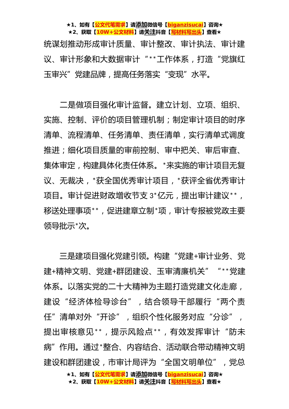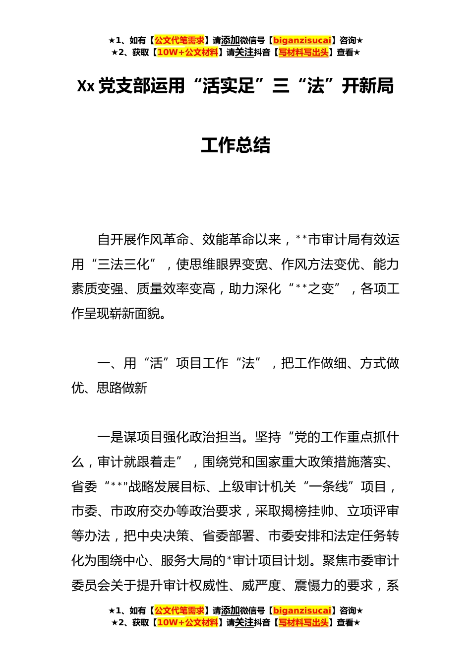 ★1、如有【公文代笔需求】请添加微信号【biganzisucai】咨询★★2、获取【10W+公文材料】请关注抖音【写材料写出头】查看★Xx党支部运用“活实足”三“法”开新局工作总结自开展作风革命、效能革命以来,**市审计局有效运用“三法三化”,使思维眼界变宽、作风方法变优、能力素质变强、质量效率变高,助力深化“**之变”,各项工作呈现崭新面貌。一、用“活”项目工作“法”,把工作做细、方式做优、思路做新一是谋项目强化政治担当。坚持“党的工作重点抓什么,审计就跟着走”,围绕党和国家重大政策措施落实、省委“**”战略发展目标、上级审计机关“一条线”项目,市委、市政府交办等政治要求,采取揭榜挂帅、立项评审等办法,把中央决策、省委部署、市委安排和法定任务转化为围绕中心、服务大局的*审计项目计...