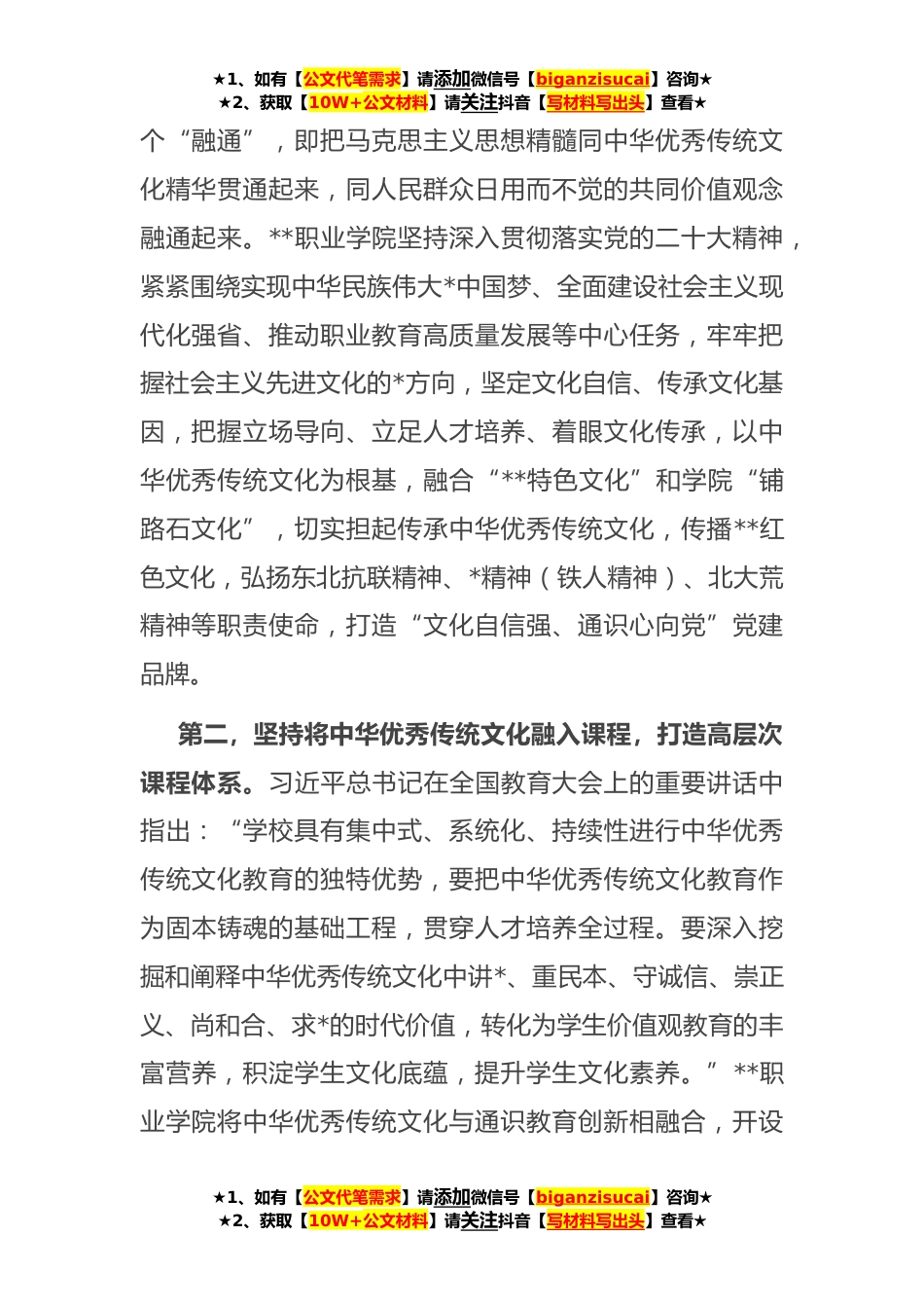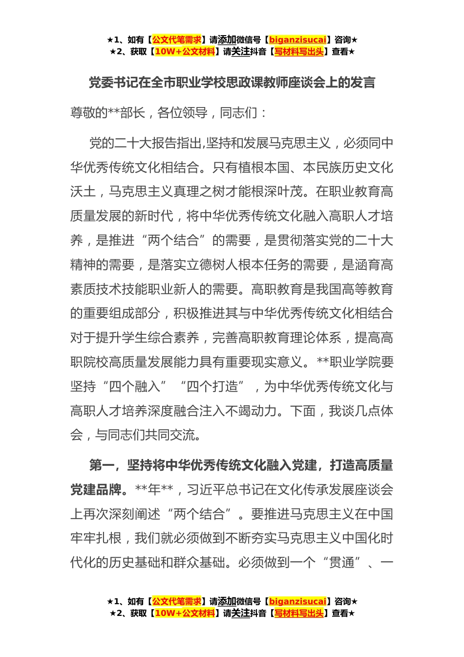 ★1、如有【公文代笔需求】请添加微信号【biganzisucai】咨询★★2、获取【10W+公文材料】请关注抖音【写材料写出头】查看★党委书记在全市职业学校思政课教师座谈会上的发言尊敬的**部长,各位领导,同志们:党的二十大报告指出,坚持和发展马克思主义,必须同中华优秀传统文化相结合。只有植根本国、本民族历史文化沃土,马克思主义真理之树才能根深叶茂。在职业教育高质量发展的新时代,将中华优秀传统文化融入高职人才培养,是推进“两个结合”的需要,是贯彻落实党的二十大精神的需要,是落实立德树人根本任务的需要,是涵育高素质技术技能职业新人的需要。高职教育是我国高等教育的重要组成部分,积极推进其与中华优秀传统文化相结合对于提升学生综合素养,完善高职教育理论体系,提高高职院校高质量发展能力...