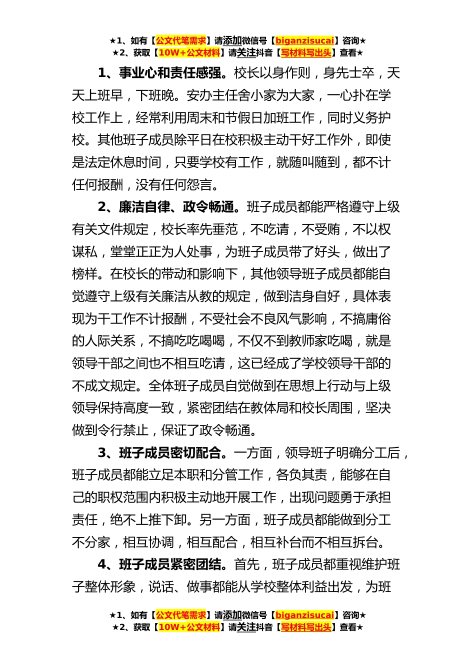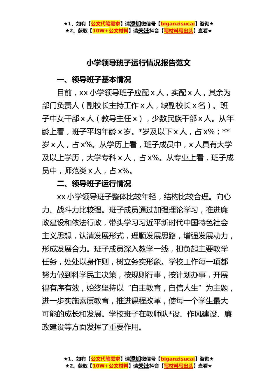 ★1、如有【公文代笔需求】请添加微信号【biganzisucai】咨询★★2、获取【10W+公文材料】请关注抖音【写材料写出头】查看★小学领导班子运行情况报告范文一、领导班子基本情况目前,xx小学领导班子应配x人,实配x人,其余为部门负责人(副校长主持工作x人,缺副校长x名)。班子中女干部x人(教导主任x),少数民族干部x人。从年龄上看,班子平均年龄x岁。*岁及以下x人,占x%;**岁x人,占x%。从学历上看,班子成员中,x人具有大学及以上学历,大学专科x人,占x%。从专业上看,班子成员中,师范类x人,占x%。二、领导班子运行情况xx小学领导班子整体比较年轻,结构比较合理。向心力、战斗力比较强。班子成员通过加强理论学习,推进廉政建设和依法行政,带头学习习近平新时代中国特色社会主义思想,认清发展形式,...