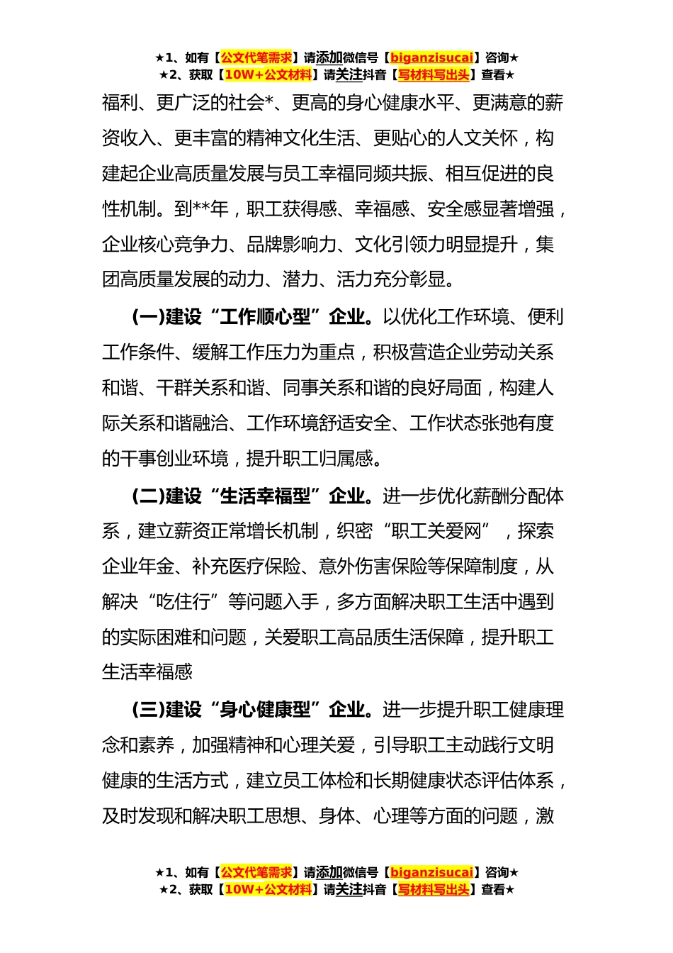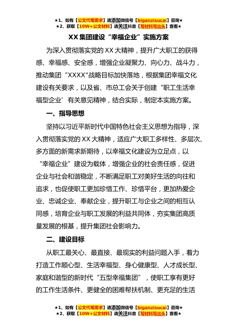 ★1、如有【公文代笔需求】请添加微信号【biganzisucai】咨询★★2、获取【10W+公文材料】请关注抖音【写材料写出头】查看★XX集团建设“幸福企业”实施方案为深入贯彻落实党的XX大精神,提升广大职工的获得感、幸福感、安全感,增强企业凝聚力、向心力、战斗力,推动集团“XXXX”战略目标加快落地,根据集团幸福文化建设有关要求,以及省、市总工会关于创建“职工生活幸福型企业’有关意见精神,结合实际,制定本实施方案。一、指导思想坚持以习近平新时代中国特色社会主义思想为指导,深入贯彻落实党的XX大精神,适应广大职工多样性、多层次、多方面的新需求新期待,以幸福文化建设为立足点,以“幸福企业”建设为载体,增强企业的社会责任感,促进企业与社会和谐稳定,不断满足职工对美好生活的向往和追求,也...