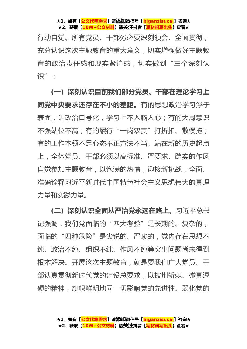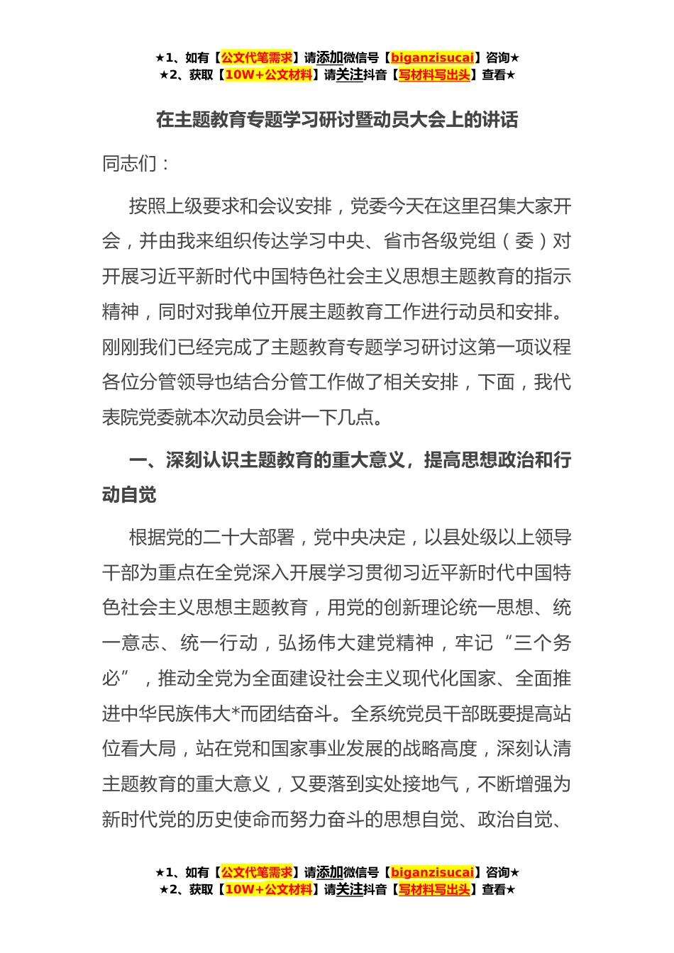 ★1、如有【公文代笔需求】请添加微信号【biganzisucai】咨询★★2、获取【10W+公文材料】请关注抖音【写材料写出头】查看★在主题教育专题学习研讨暨动员大会上的讲话同志们:按照上级要求和会议安排,党委今天在这里召集大家开会,并由我来组织传达学习中央、省市各级党组(委)对开展习近平新时代中国特色社会主义思想主题教育的指示精神,同时对我单位开展主题教育工作进行动员和安排。刚刚我们已经完成了主题教育专题学习研讨这第一项议程各位分管领导也结合分管工作做了相关安排,下面,我代表院党委就本次动员会讲一下几点。一、深刻认识主题教育的重大意义,提高思想政治和行动自觉根据党的二十大部署,党中央决定,以县处级以上领导干部为重点在全党深入开展学习贯彻习近平新时代中国特色社会主义思想主...