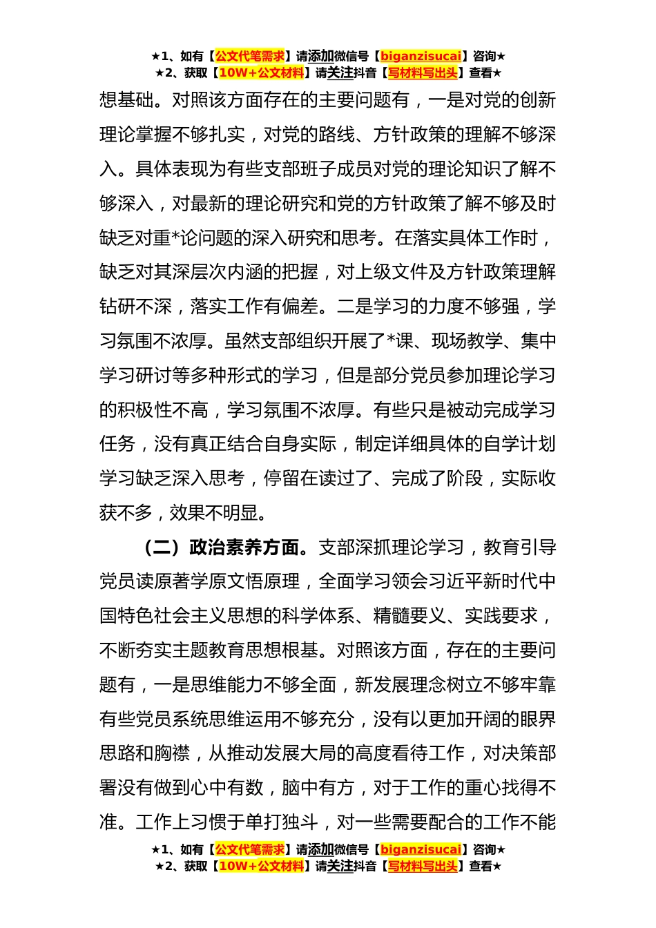 ★1、如有【公文代笔需求】请添加微信号【biganzisucai】咨询★★2、获取【10W+公文材料】请关注抖音【写材料写出头】查看★**年主题教育专题组织生活会支部班子对照检查材料按照X党委关于组织开展主题教育专题组织生活会的总体安排部署,根据这次专题组织生活会的相关要求,X支部班子立即对各项工作进行安排部署,并严格对照通知要求的六个方面进行全面检视。为将问题找准找实,支部班子召开专题会议,紧紧围绕“以学铸魂、以学增智、以学正风、以学促干”,进行了一次深刻的思想淬炼和灵魂洗礼,结合主题教育开展情况、结合工作实际,深刻透彻查摆问题,深挖根源直击问题本质,理出问题清单,逐项对照拟定整改措施,真正做到把问题找准、把原因分析透、把措施提实。现将支部班子对照检查汇报如下:一、存在的问...