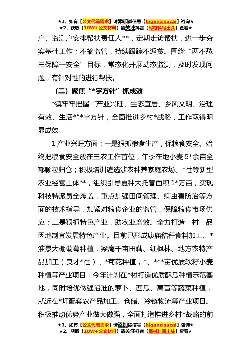 ★1、如有【公文代笔需求】请添加微信号【biganzisucai】咨询★★2、获取【10W+公文材料】请关注抖音【写材料写出头】查看★镇**年“四个聚焦”乡村*工作汇报一、基本概况*镇现辖*个行政村,其中有乡村*任务的村为*个。共有人口5*人,农村人口3*余人。镇域面积*平方公里,耕地5*万亩(水稻产地万亩,行洪区沙土地2*万亩)。现有脱贫户****人,监测户***(其中**年新识别监测户*户*人,其中落实开发式帮扶措施*户,纳入整户低保兜底户*)。二、工作开展情况*镇以巩固拓展脱贫攻坚成果为重点,以实现农民增收为目标,按照中央和省市区关于乡村*工作的部署和要求,紧密结合实际,抓好四个“聚焦”,扎实做好各项工作。(一)聚焦“四个不摘”抓落实常态化统筹、协调、调度巩固拓展脱贫成果与乡村*有效衔接工作。不摘...