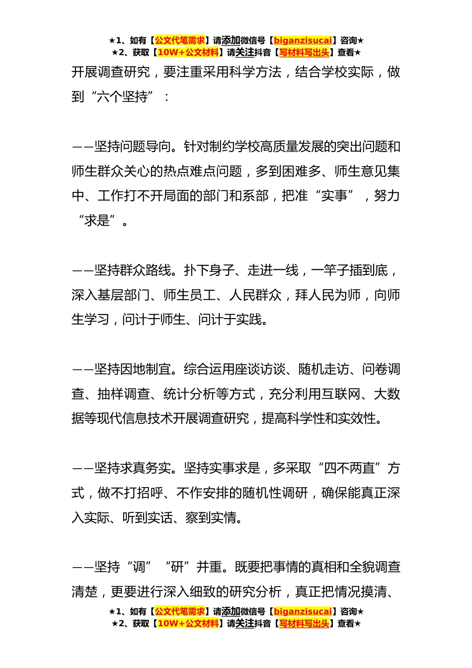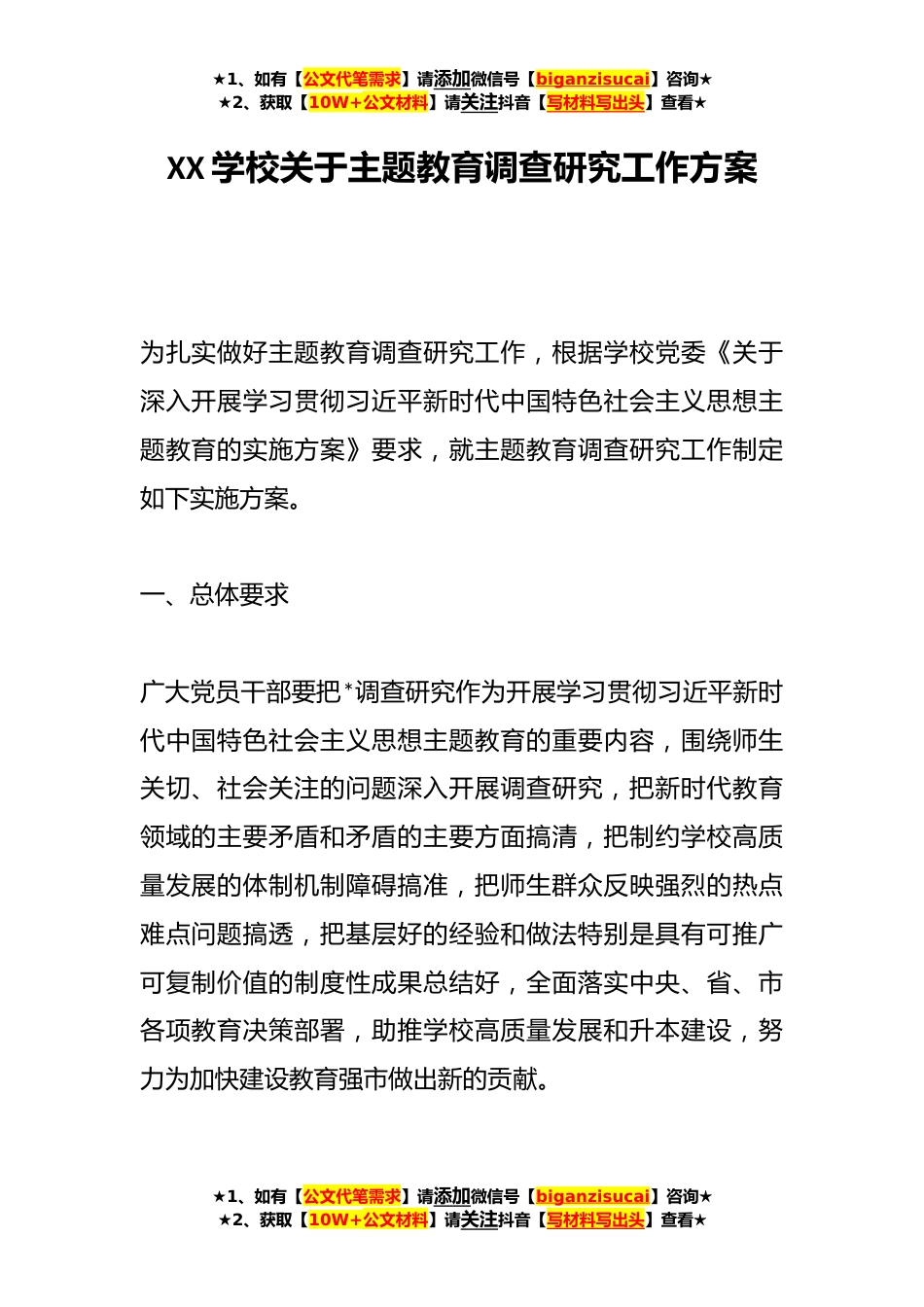 ★1、如有【公文代笔需求】请添加微信号【biganzisucai】咨询★★2、获取【10W+公文材料】请关注抖音【写材料写出头】查看★XX学校关于主题教育调查研究工作方案为扎实做好主题教育调查研究工作,根据学校党委《关于深入开展学习贯彻习近平新时代中国特色社会主义思想主题教育的实施方案》要求,就主题教育调查研究工作制定如下实施方案。一、总体要求广大党员干部要把*调查研究作为开展学习贯彻习近平新时代中国特色社会主义思想主题教育的重要内容,围绕师生关切、社会关注的问题深入开展调查研究,把新时代教育领域的主要矛盾和矛盾的主要方面搞清,把制约学校高质量发展的体制机制障碍搞准,把师生群众反映强烈的热点难点问题搞透,把基层好的经验和做法特别是具有可推广可复制价值的制度性成果总结好,全面落...