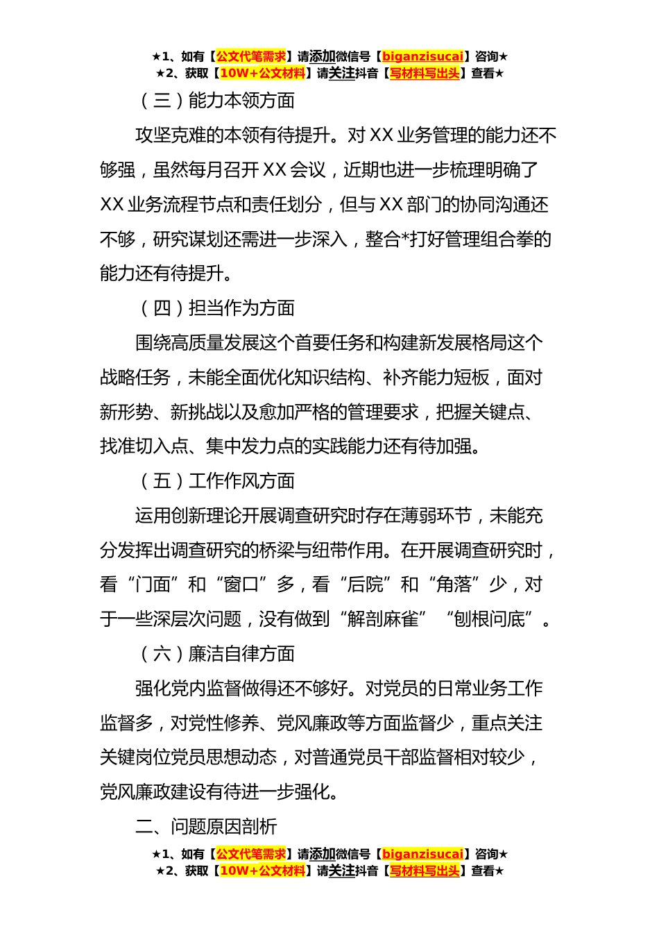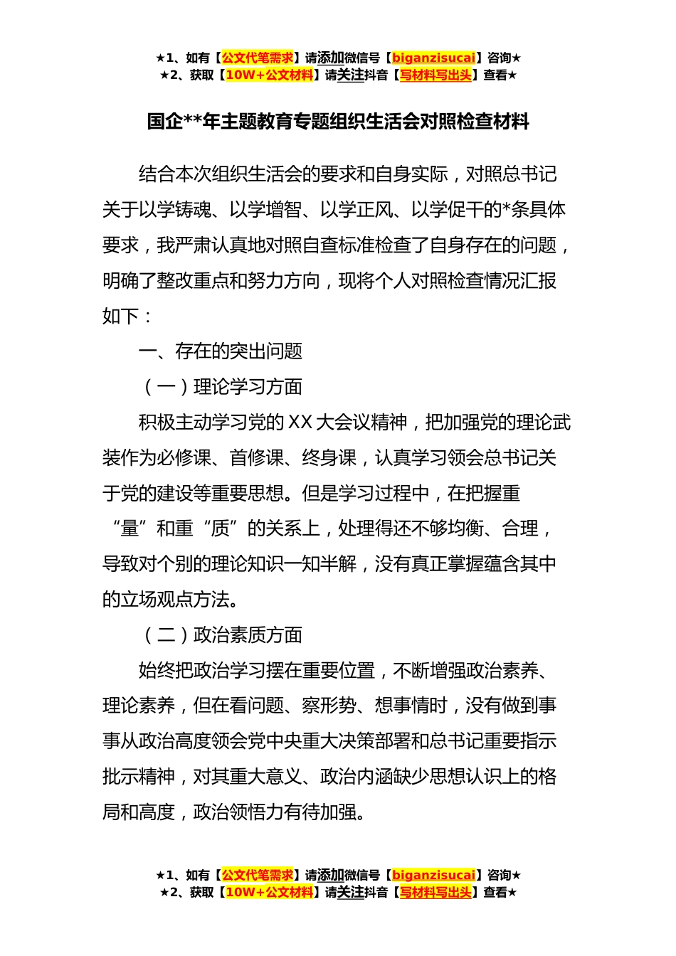 ★1、如有【公文代笔需求】请添加微信号【biganzisucai】咨询★★2、获取【10W+公文材料】请关注抖音【写材料写出头】查看★国企**年主题教育专题组织生活会对照检查材料结合本次组织生活会的要求和自身实际,对照总书记关于以学铸魂、以学增智、以学正风、以学促干的*条具体要求,我严肃认真地对照自查标准检查了自身存在的问题,明确了整改重点和努力方向,现将个人对照检查情况汇报如下:一、存在的突出问题(一)理论学习方面积极主动学习党的XX大会议精神,把加强党的理论武装作为必修课、首修课、终身课,认真学习领会总书记关于党的建设等重要思想。但是学习过程中,在把握重“量”和重“质”的关系上,处理得还不够均衡、合理,导致对个别的理论知识一知半解,没有真正掌握蕴含其中的立场观点方法。(二)...