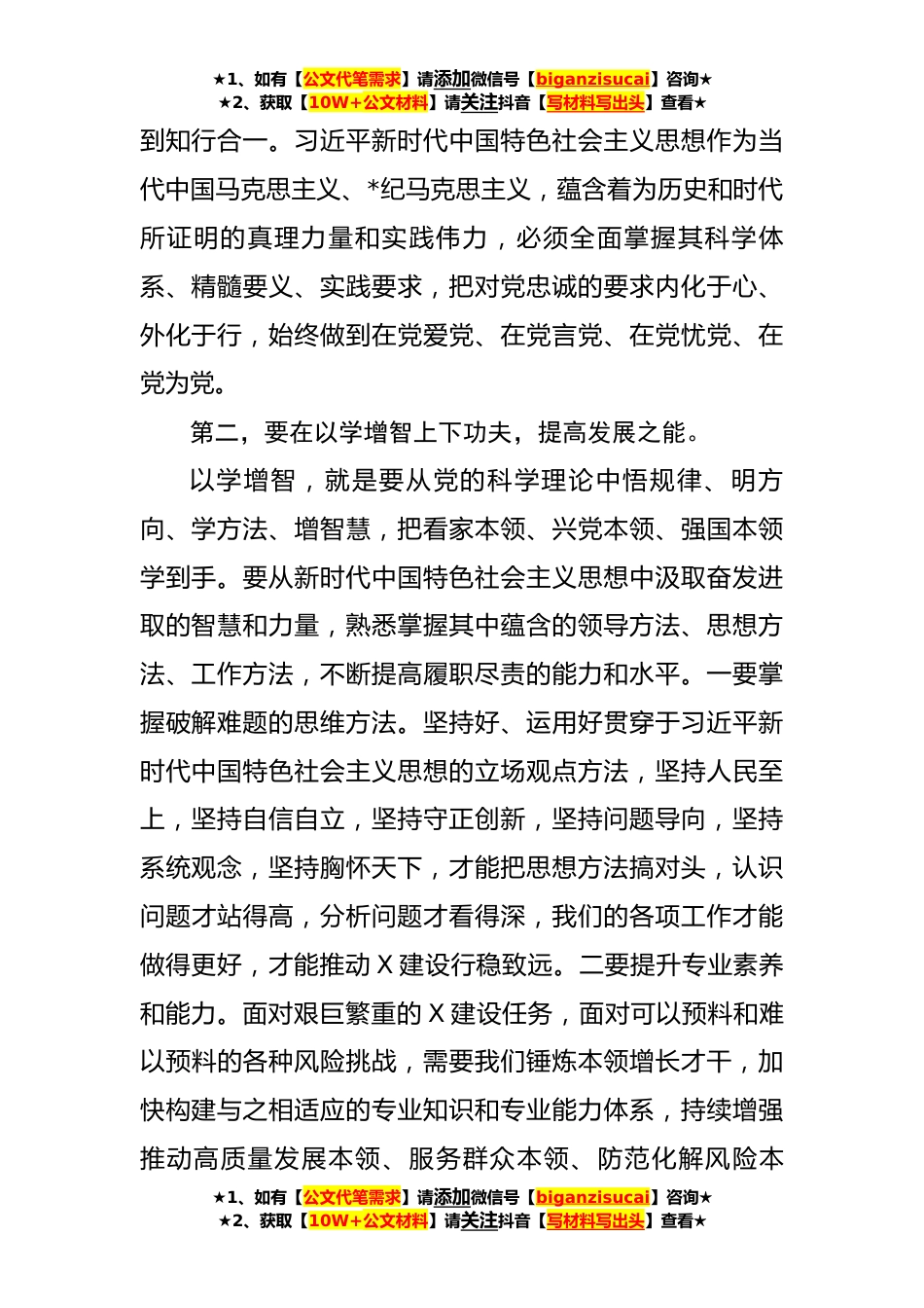 ★1、如有【公文代笔需求】请添加微信号【biganzisucai】咨询★★2、获取【10W+公文材料】请关注抖音【写材料写出头】查看★在全县主题教育专题学习暨动员部署会上的讲话(**)第二批同志们:近日,学习贯彻习近平新时代中国特色社会主义思想主题教育第一批总结暨第二批部署会议在京召开。会议强调要把开展第二批主题教育作为重要政治任务紧紧抓在手上,善始善终、善作善成,确保取得实效。我们要把习近平总书记的重要指示作为根本遵循,在主题教育中大力弘扬马克思主义学风,以“学”为主线,努力在以学铸魂、以学增智、以学正风、以学促干方面下功夫见实效,进一步汇聚起全县上下乘势而上、拼搏实干的智慧和力量。下面,我就主题教育学习具体提四点要求。第一,要在以学铸魂上下功夫,筑牢信仰之基。以学铸魂,...