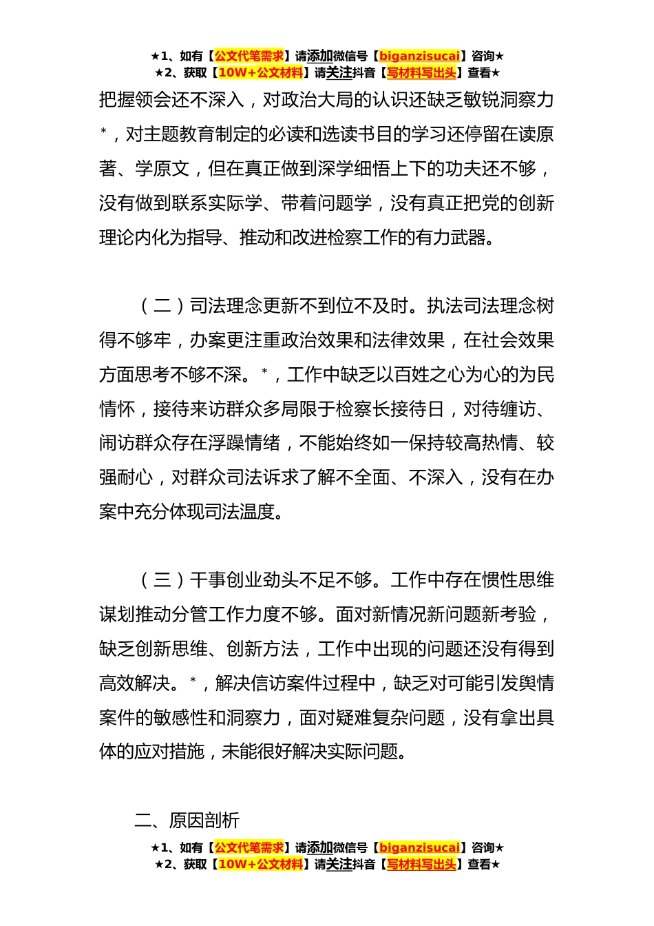 ★1、如有【公文代笔需求】请添加微信号【biganzisucai】咨询★★2、获取【10W+公文材料】请关注抖音【写材料写出头】查看★有关检察院**年主题教育专题组织生活会个人发言提纲按照院党组《***会议方案》要求,我通过个人自学和集中学习研讨,深入学习了A新时代中国特色社会主义思想、A法治思想和《A谈治国理政》第四卷,认真学习党的二十大报告、党章和《关于新形势下党内政治生活的若干准则》,学习等。主题教育专题组织生活会召开前,我与所在支部全体党员进行谈心谈话,对征求到的意见建议进行总结归纳,并结合自身实际,对照本次专题民主生活会内容认真进行查摆,深入剖析原因,并制定整改措施。现汇报如下:一、存在的突出问题(一)政治理论学习不全面不系统。对A新时代中国特色社会主义思想,尤其是对A法...