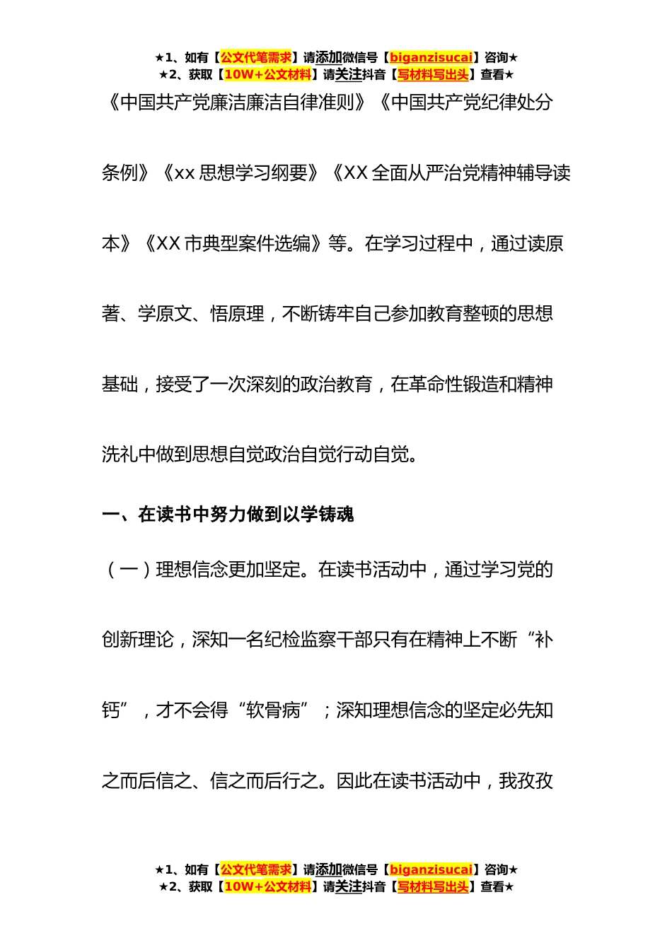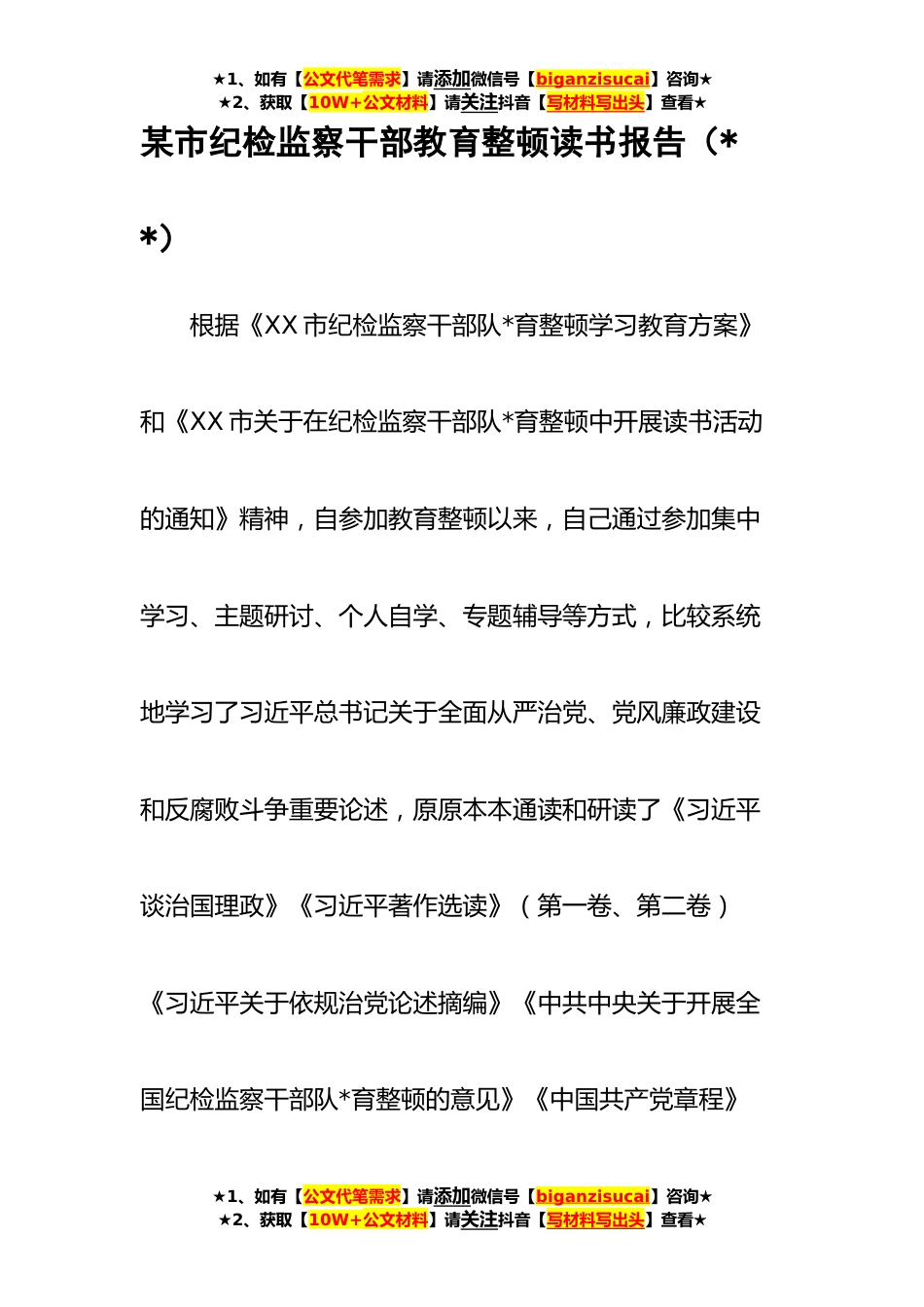 ★1、如有【公文代笔需求】请添加微信号【biganzisucai】咨询★★2、获取【10W+公文材料】请关注抖音【写材料写出头】查看★某市纪检监察干部教育整顿读书报告(**)根据《XX市纪检监察干部队*育整顿学习教育方案》和《XX市关于在纪检监察干部队*育整顿中开展读书活动的通知》精神,自参加教育整顿以来,自己通过参加集中学习、主题研讨、个人自学、专题辅导等方式,比较系统地学习了习近平总书记关于全面从严治党、党风廉政建设和反腐败斗争重要论述,原原本本通读和研读了《习近平谈治国理政》《习近平著作选读》(第一卷、第二卷)《习近平关于依规治党论述摘编》《中共中央关于开展全国纪检监察干部队*育整顿的意见》《中国共产党章程》★1、如有【公文代笔需求】请添加微信号【biganzisucai】咨询★★2、获取...