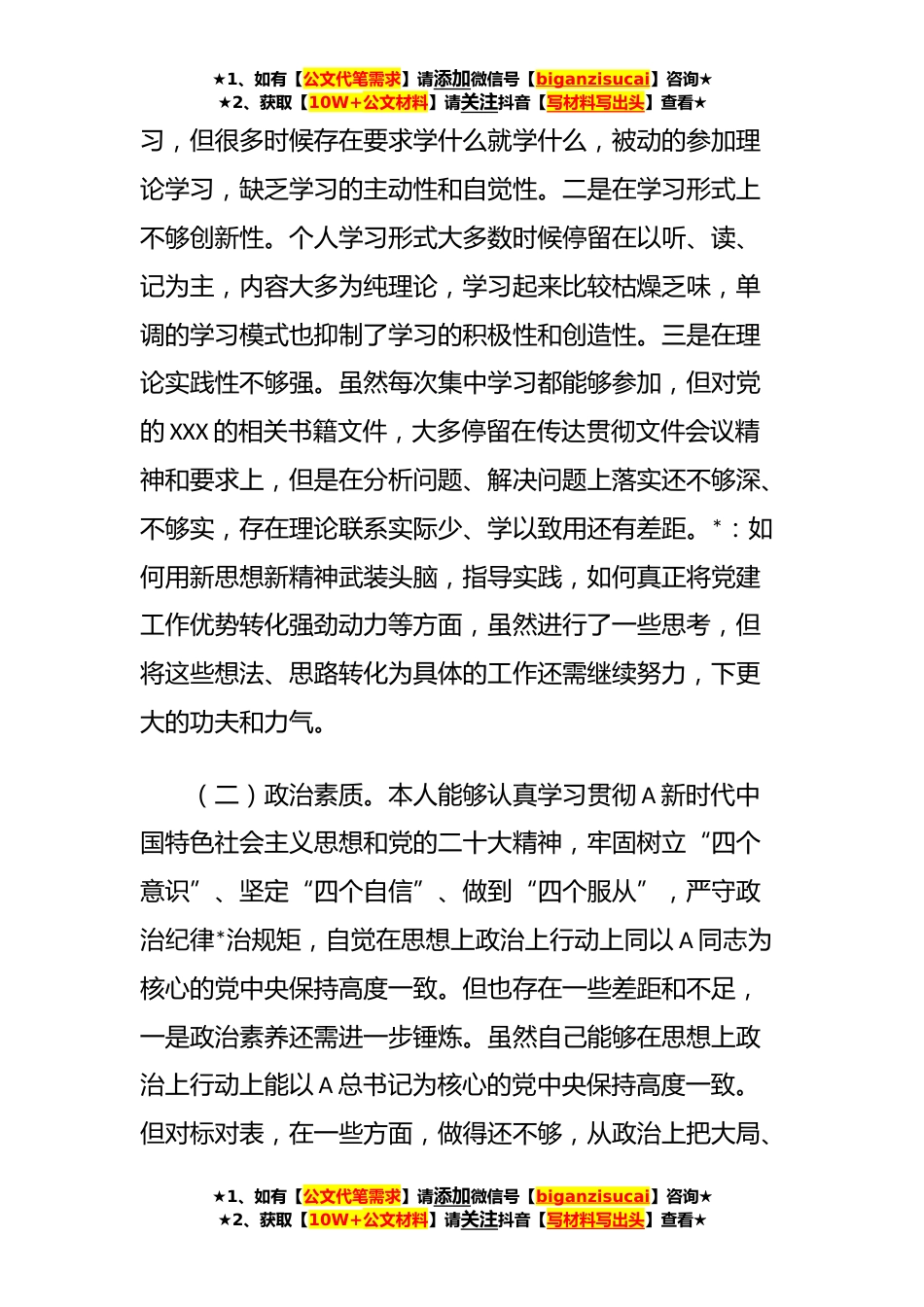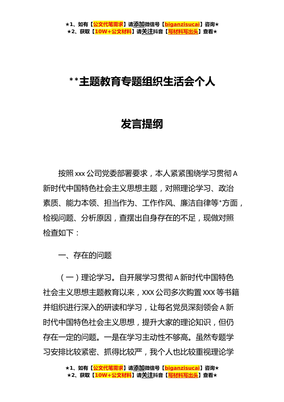 ★1、如有【公文代笔需求】请添加微信号【biganzisucai】咨询★★2、获取【10W+公文材料】请关注抖音【写材料写出头】查看★**主题教育专题组织生活会个人发言提纲按照xxx公司党委部署要求,本人紧紧围绕学习贯彻A新时代中国特色社会主义思想主题,对照理论学习、政治素质、能力本领、担当作为、工作作风、廉洁自律等*方面,检视问题、分析原因,查摆出自身存在的不足,现做对照检查如下:一、存在的问题(一)理论学习。自开展学习贯彻A新时代中国特色社会主义思想主题教育以来,XXX公司多次购置XXX等书籍并组织进行深入的研读和学习,让每名党员深刻领会A新时代中国特色社会主义思想,提升大家的理论知识,但仍存在一定的问题。一是在学习主动性不够高。虽然专题学习安排比较紧密、抓得比较严,我个人也比较重视...