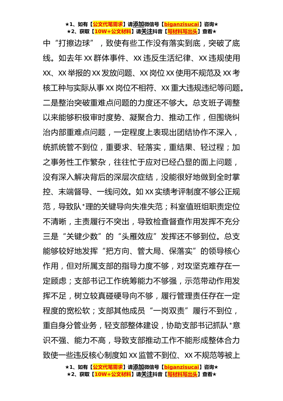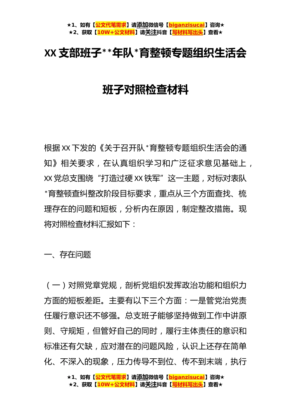 ★1、如有【公文代笔需求】请添加微信号【biganzisucai】咨询★★2、获取【10W+公文材料】请关注抖音【写材料写出头】查看★XX支部班子**年队*育整顿专题组织生活会班子对照检查材料根据XX下发的《关于召开队*育整顿专题组织生活会的通知》相关要求,在认真组织学习和广泛征求意见基础上,XX党总支围绕“打造过硬XX铁军”这一主题,对标对表队*育整顿查纠整改阶段目标要求,重点从三个方面查找、梳理存在的问题和短板,分析内在原因,制定整改措施。现将对照检查材料汇报如下:一、存在问题(一)对照党章党规,剖析党组织发挥政治功能和组织力方面的短板差距。主要有以下三个方面:一是管党治党责任履行意识还不够强。总支班子能够坚持做到工作中讲原则、守规矩,但管好自己的同时,履行主体责任的意识和标准还有...