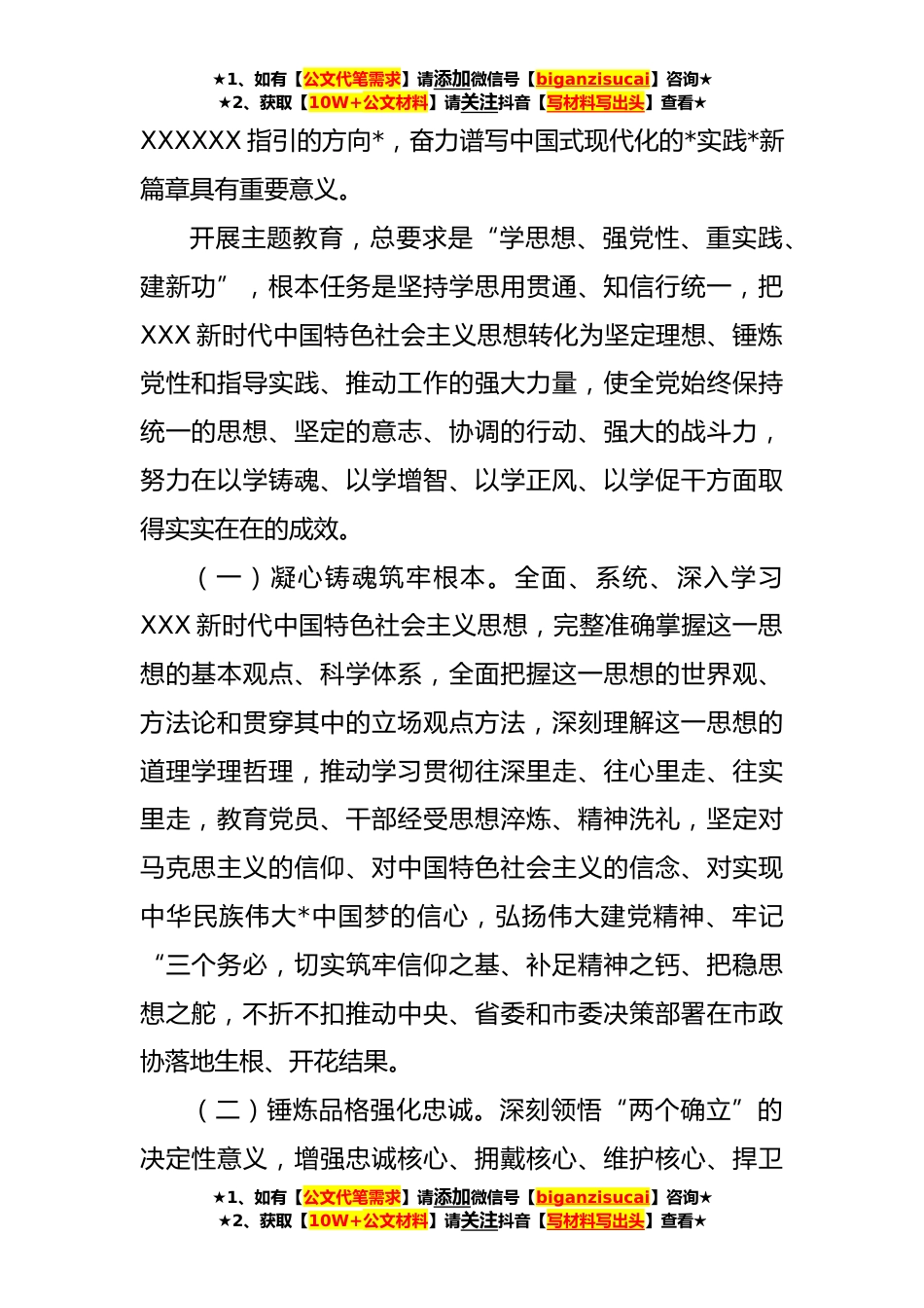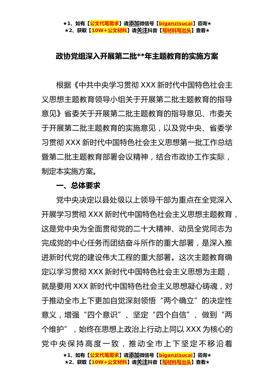 ★1、如有【公文代笔需求】请添加微信号【biganzisucai】咨询★★2、获取【10W+公文材料】请关注抖音【写材料写出头】查看★政协党组深入开展第二批**年主题教育的实施方案根据《中共中央学习贯彻XXX新时代中国特色社会主义思想主题教育领导小组关于开展第二批主题教育的指导意见》省委关于开展第二批主题教育的指导意见、市委关于开展第二批主题教育的实施意见,以及党中央、省委学习贯彻XXX新时代中国特色社会主义思想第一批工作总结暨第二批主题教育部署会议精神,结合市政协工作实际,制定本实施方案。一、总体要求党中央决定以县处级以上领导干部为重点在全党深入开展学习贯彻XXX新时代中国特色社会主义思想主题教育,这是党中央为全面贯彻党的二十大精神、动员全党同志为完成党的中心任务而团结奋斗所作的重...