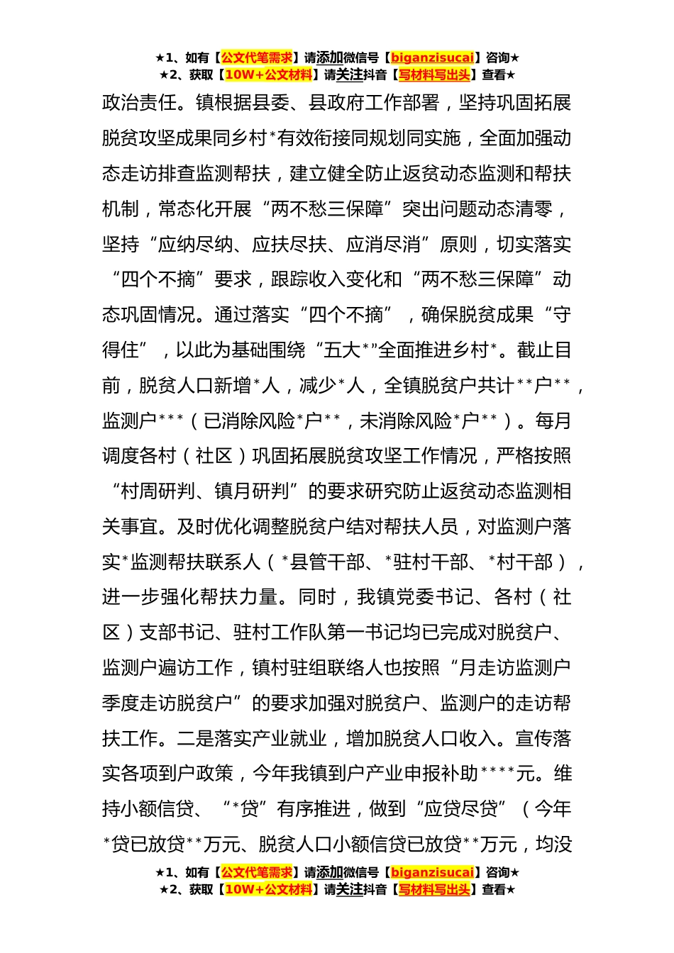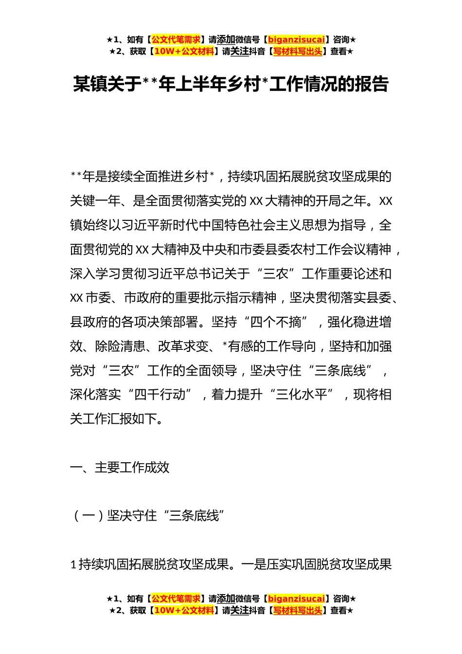 ★1、如有【公文代笔需求】请添加微信号【biganzisucai】咨询★★2、获取【10W+公文材料】请关注抖音【写材料写出头】查看★某镇关于**年上半年乡村*工作情况的报告**年是接续全面推进乡村*,持续巩固拓展脱贫攻坚成果的关键一年、是全面贯彻落实党的XX大精神的开局之年。XX镇始终以习近平新时代中国特色社会主义思想为指导,全面贯彻党的XX大精神及中央和市委县委农村工作会议精神,深入学习贯彻习近平总书记关于“三农”工作重要论述和XX市委、市政府的重要批示指示精神,坚决贯彻落实县委、县政府的各项决策部署。坚持“四个不摘”,强化稳进增效、除险清患、改革求变、*有感的工作导向,坚持和加强党对“三农”工作的全面领导,坚决守住“三条底线”,深化落实“四千行动”,着力提升“三化水平”,现将相关工...