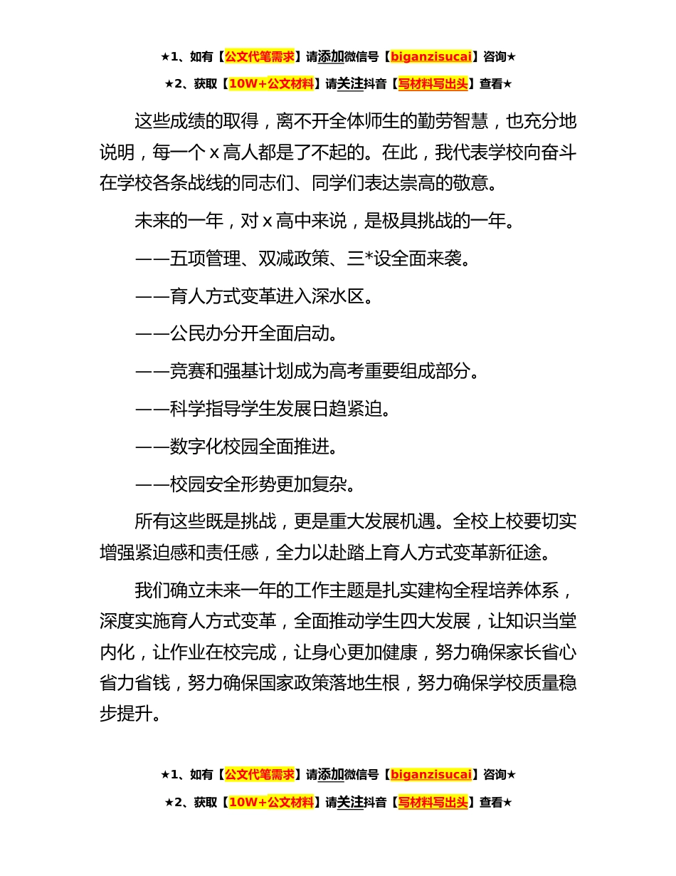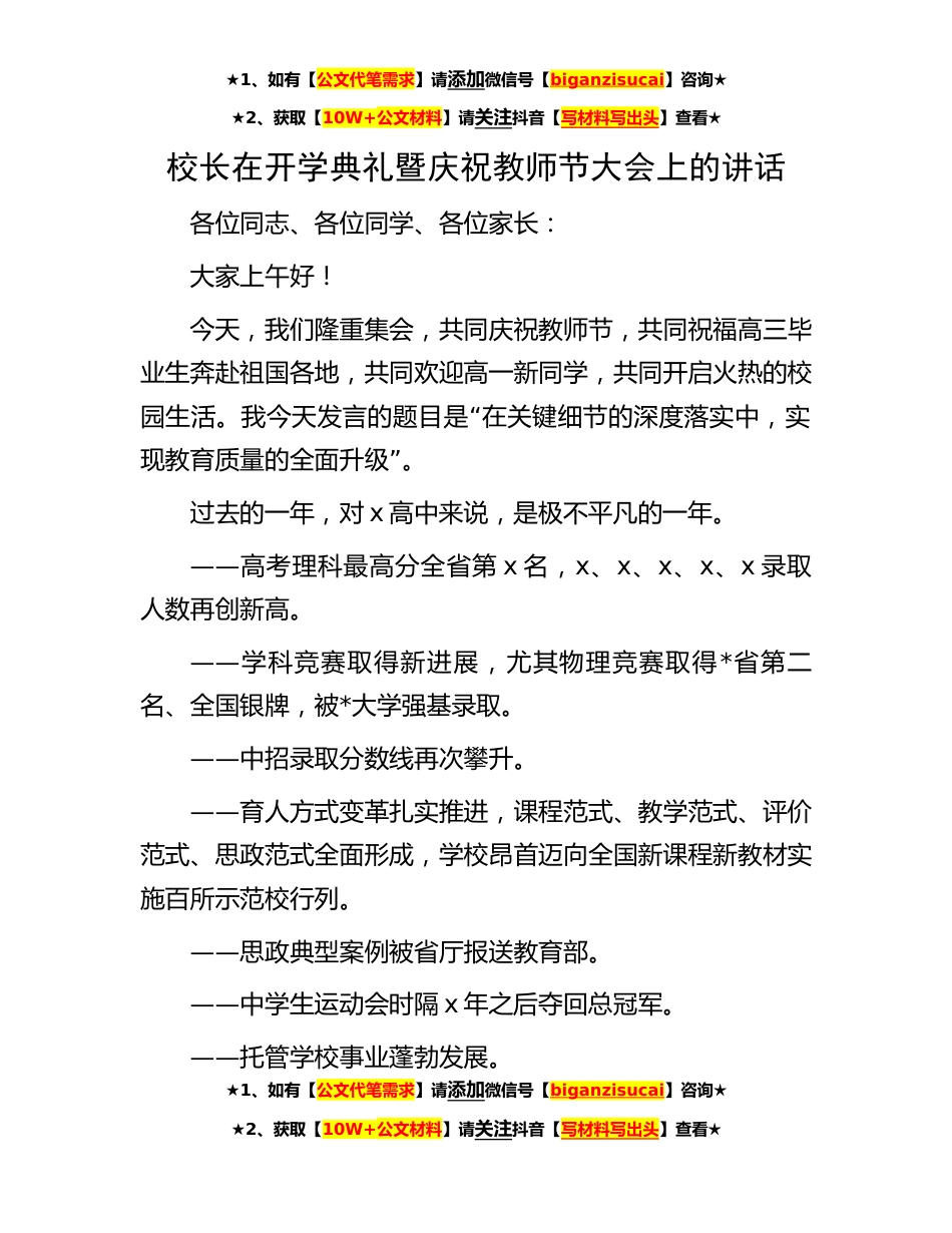 ★1、如有【公文代笔需求】请添加微信号【biganzisucai】咨询★★2、获取【10W+公文材料】请关注抖音【写材料写出头】查看★校长在开学典礼暨庆祝教师节大会上的讲话各位同志、各位同学、各位家长:大家上午好!今天,我们隆重集会,共同庆祝教师节,共同祝福高三毕业生奔赴祖国各地,共同欢迎高一新同学,共同开启火热的校“园生活。我今天发言的题目是在关键细节的深度落实中,实”现教育质量的全面升级。过去的一年,对x高中来说,是极不平凡的一年。——高考理科最高分全省第x名,x、x、x、x、x录取人数再创新高。——学科竞赛取得新进展,尤其物理竞赛取得*省第二名、全国银牌,被*大学强基录取。——中招录取分数线再次攀升。——育人方式变革扎实推进,课程范式、教学范式、评价范式、思政范式全面形成,学...
